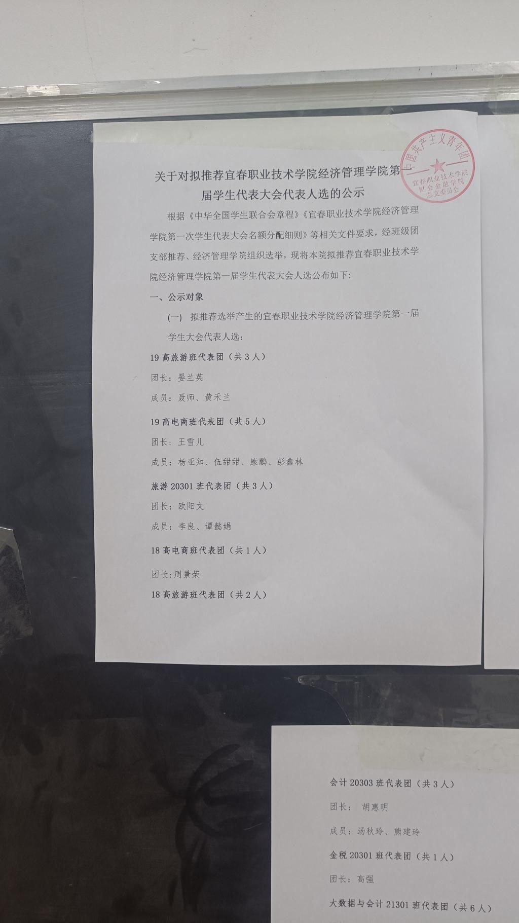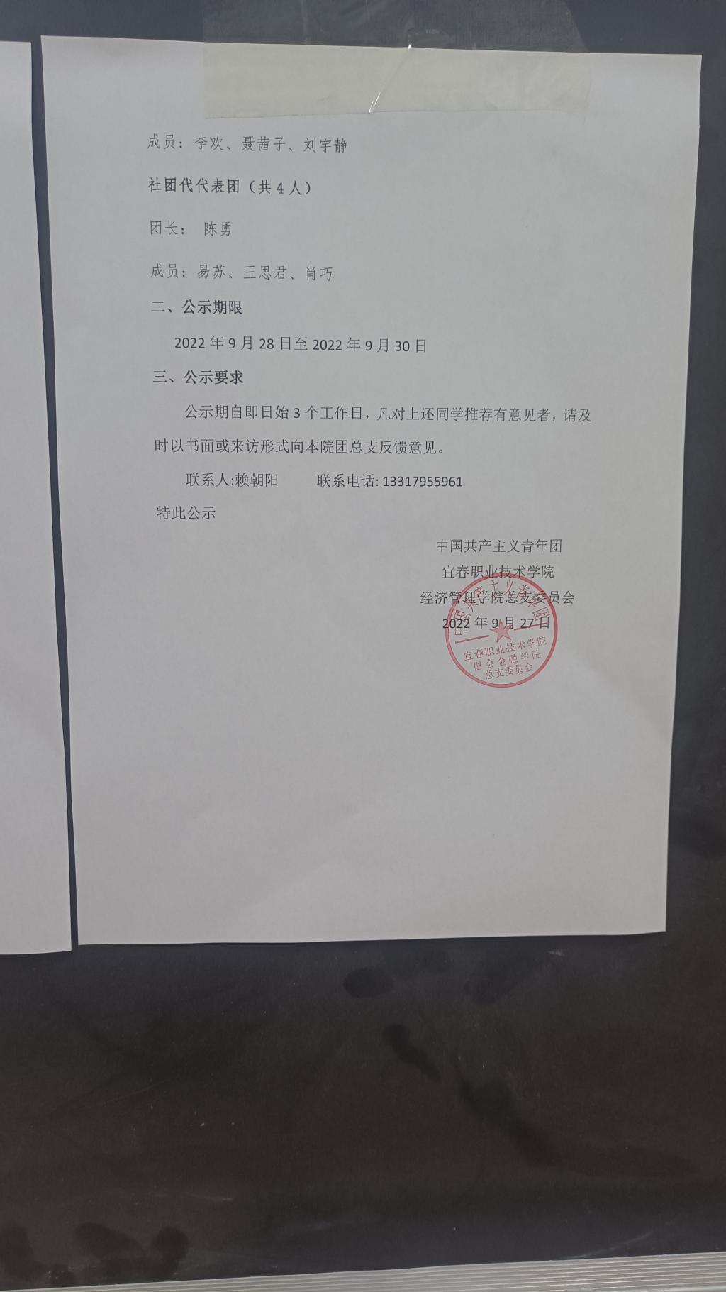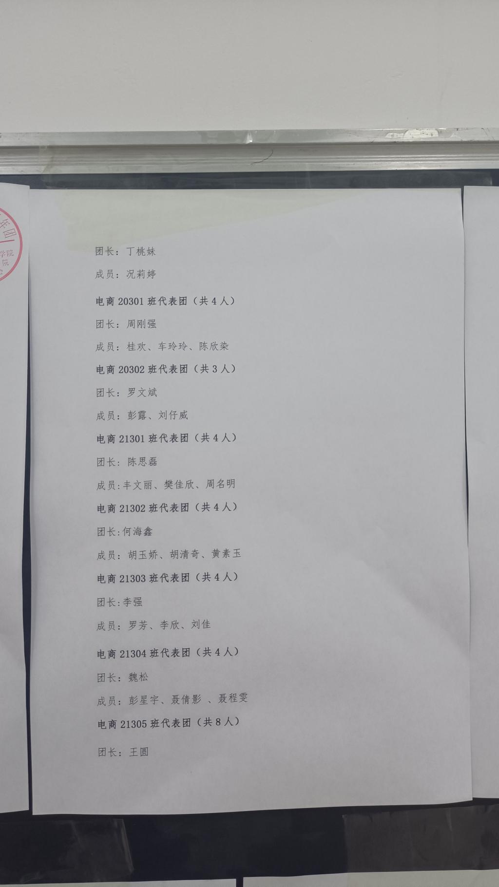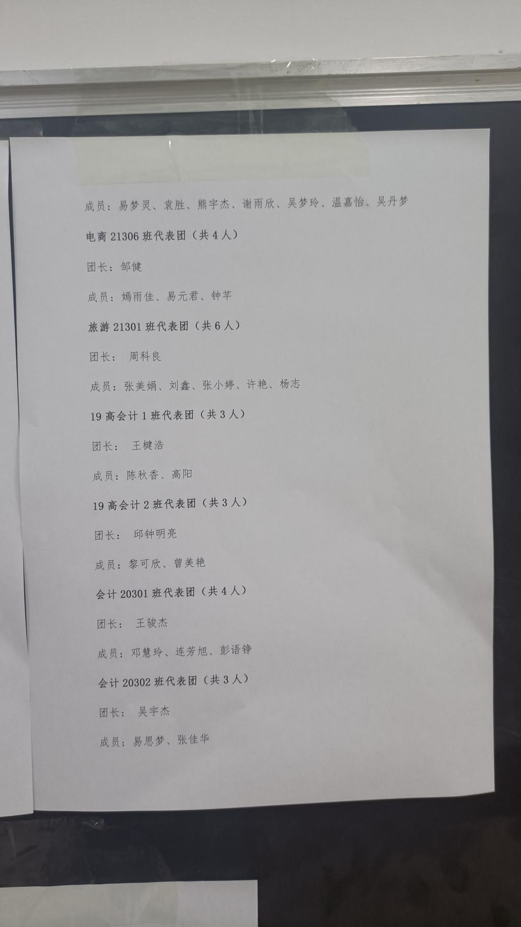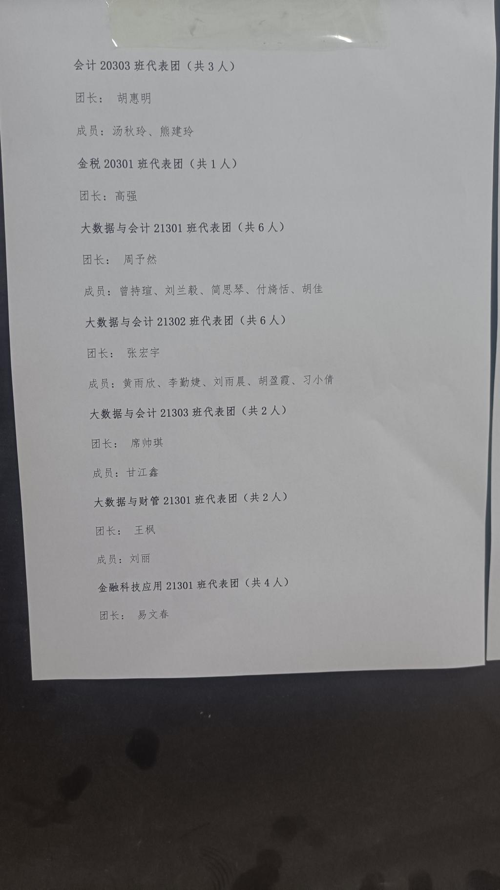 根据《中华全国学生联合会章程》《kaiyun开云官方网站经济管理学院第一次学生代表大会名额分配细则》等相关文件要求,经班级团支部推荐、经济管理学院组织选举,现将本院拟推荐kaiyun开云官方网站经济管理学院第一届学生代表大会人选公布如下: 一、公示对象 (一) 拟推荐选举产生的kaiyun开云官方网站经济管理学院第一届学生大会代表人选: 19高旅游班代表团(共3人) 团长:晏兰英 成员:聂师、黄禾兰 19高电商班代表团(共5人) 团长: 王雪儿 成员:杨亚知、伍甜甜、康鹏、彭鑫林 旅游20301班代表团(共3人) 团长:欧阳文 成员:李良、谭懿娟 18高电商班代表团(共1人) 团长:周景荣 18高旅游班代表团(共2人) 团长:丁桃妹 成员:况莉婷 电商20301班代表团(共4人) 团长:周刚强 成员:桂欢、车玲玲、陈欣染 电商20302班代表团(共3人) 团长:罗文斌 成员:彭露、刘仔威 电商21301班代表团(共4人) 团长: 陈思磊 成员:丰文丽、樊佳欣、周名明 电商21302班代表团(共4人) 团长:何海鑫 成员:胡玉娇、胡清奇、黄素玉 电商21303班代表团(共4人) 团长:李强 成员:罗芳、李欣、刘佳 电商21304班代表团(共4人) 团长:魏松 成员:彭星宇、聂倩影 、聂程雯 电商21305班代表团(共8人) 团长:王圆 成员:易梦灵、袁胜、熊宇杰、谢雨欣、吴梦玲、温嘉怡、吴丹梦 电商21306班代表团(共4人) 团长:邹健 成员:嫣雨佳、易元君、钟芊 旅游21301班代表团(共6人) 团长: 周科良 成员:张美娟、刘鑫、张小婷、许艳、杨志 19高会计1班代表团(共3人) 团长: 王楗浩 成员:陈秋香、高阳 19高会计2班代表团(共3人) 团长: 邱钟明亮 成员:黎可欣、曾美艳 会计20301班代表团(共4人) 团长: 王骏杰 成员:邓慧玲、连芳旭、彭语铮 会计20302班代表团(共3人) 团长: 吴宇杰 成员:易思梦、张佳华 会计20303班代表团(共3人) 团长: 胡惠明 成员:汤秋玲、熊建玲 金税20301班代表团(共1人) 团长:高强 大数据与会计21301班代表团(共6人) 团长: 周予然 成员:曾持瑄、刘兰毅、简思琴、付旖恬、胡佳 大数据与会计21302班代表团(共6人) 团长: 张宏宇 成员:黄雨欣、李勤婕、刘雨晨、胡盈霞、习小倩 大数据与会计21303班代表团(共2人) 团长: 席帅琪 成员:甘江鑫 大数据与财管21301班代表团(共2人) 团长: 王枫 成员:刘丽 金融科技应用21301班代表团(共4人) 团长: 易文春 成员:李欢、聂茜子、刘宇静 社团代代表团(共4人) 团长: 陈勇 成员:易苏、王思君、肖巧 二、公示期限 2022年9月28日至2022年9月30日 三、公示要求 公示期自即日始3个工作日,凡对上还同学推荐有意见者,请及时以书面或来访形式向本院团总支反馈意见。 联系人:赖朝阳 联系电话: 13317955961 特此公示 中国共产主义青年团 kaiyun开云官方网站 经济管理学院总支委员会 2022年9月27日 上一条:经济管理学院召开新学期学生座谈会 下一条:经济管理学院开展党的基本知识教育活动