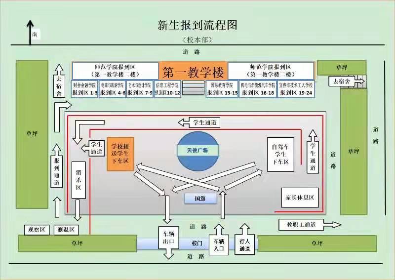 新生报到流程:校门口指定区域排队(间隔1米)→核查三码(赣通码、行程码、核酸检测报告)→行李消毒→测量体温→进入报到区域(体温正常学生)→报到→乘坐校园摆渡车到学生宿舍入住。