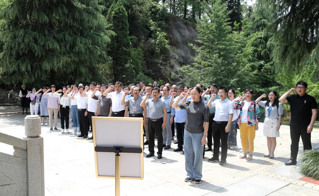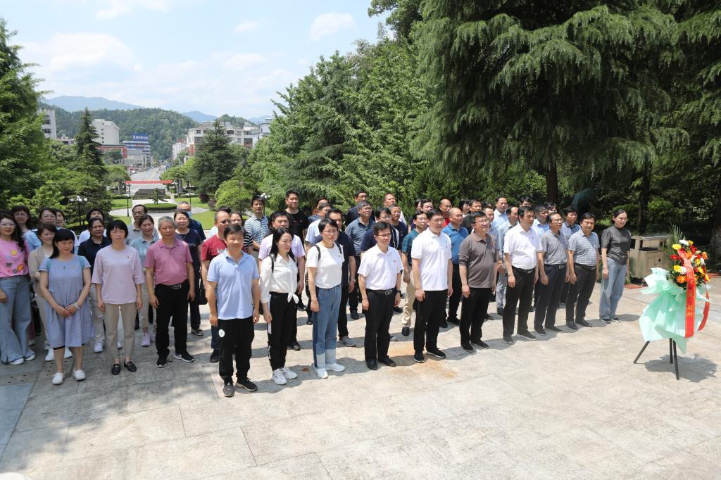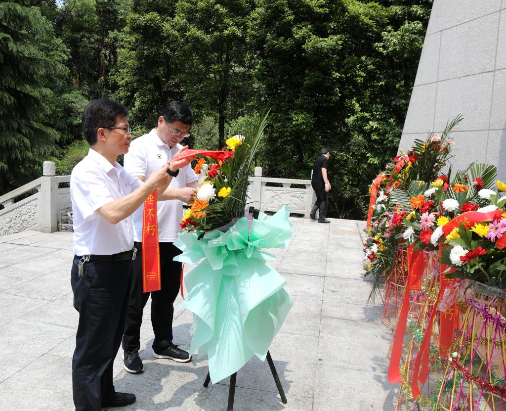 随后,一行人来到湘鄂赣烈士陵园,在革命烈士纪念碑前祭奠革命英烈,为革命英烈敬献花篮,校党委书记任军和党委副书记、校长杨云山上前整理缎带。默哀仪式结束后,党委委员、组织部部长刘叶建带领全体党员重温了入党誓词。