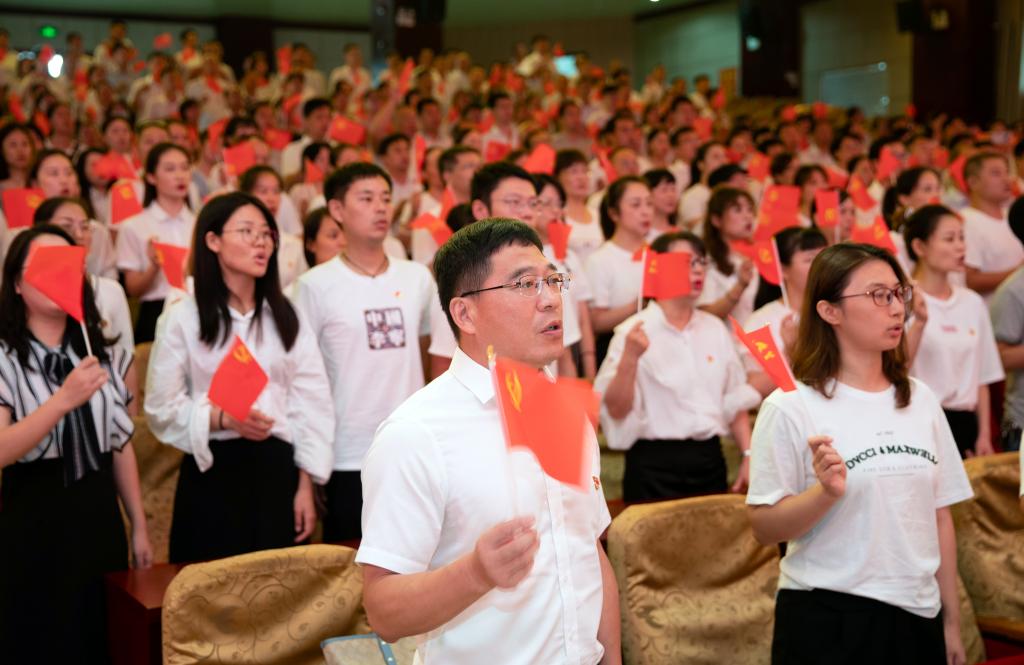 收听收看完现场直播后,在校党委书记任军的带领下,全体党员面向鲜红的党旗,高举右拳,重温入党誓词,“我志愿加入中国共产党,拥护党的纲领,遵守党的章程……”伴随着铿锵的誓词,党员教师们仿佛重回当初加入党组织的那一刻,更加坚定了自己的理想信念和党性认识。