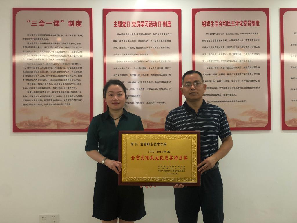 本站讯(校团委 梅应轩),9月7日上午,宜春市中心血站站长袁小玲,宣策科科长周军等一行三人赴开云官网颁发“2017-2019年度全省无偿献血促进奖特别奖”奖牌,校党委委员、副校长张印华,校团委全体工作人员参与此次授予仪式。