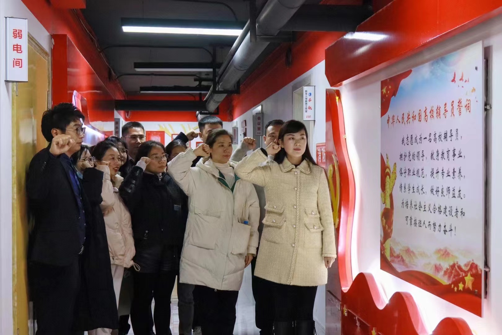 下午,张印华一行来到江西外语外贸职业学院,首先参观了该校大学生思想政治教育基地“立德树人馆”,随后进行面对面交流,双方就辅导员工作室建设、红色班级创建、学生社团管理、学生管理等进行了深入探讨。最后参观了江西省高校辅导员名师工作室——宫婷婷工作室,全体辅导员在工作室进行了宣誓,由江西省2018年“最美辅导员”宫婷婷领誓。