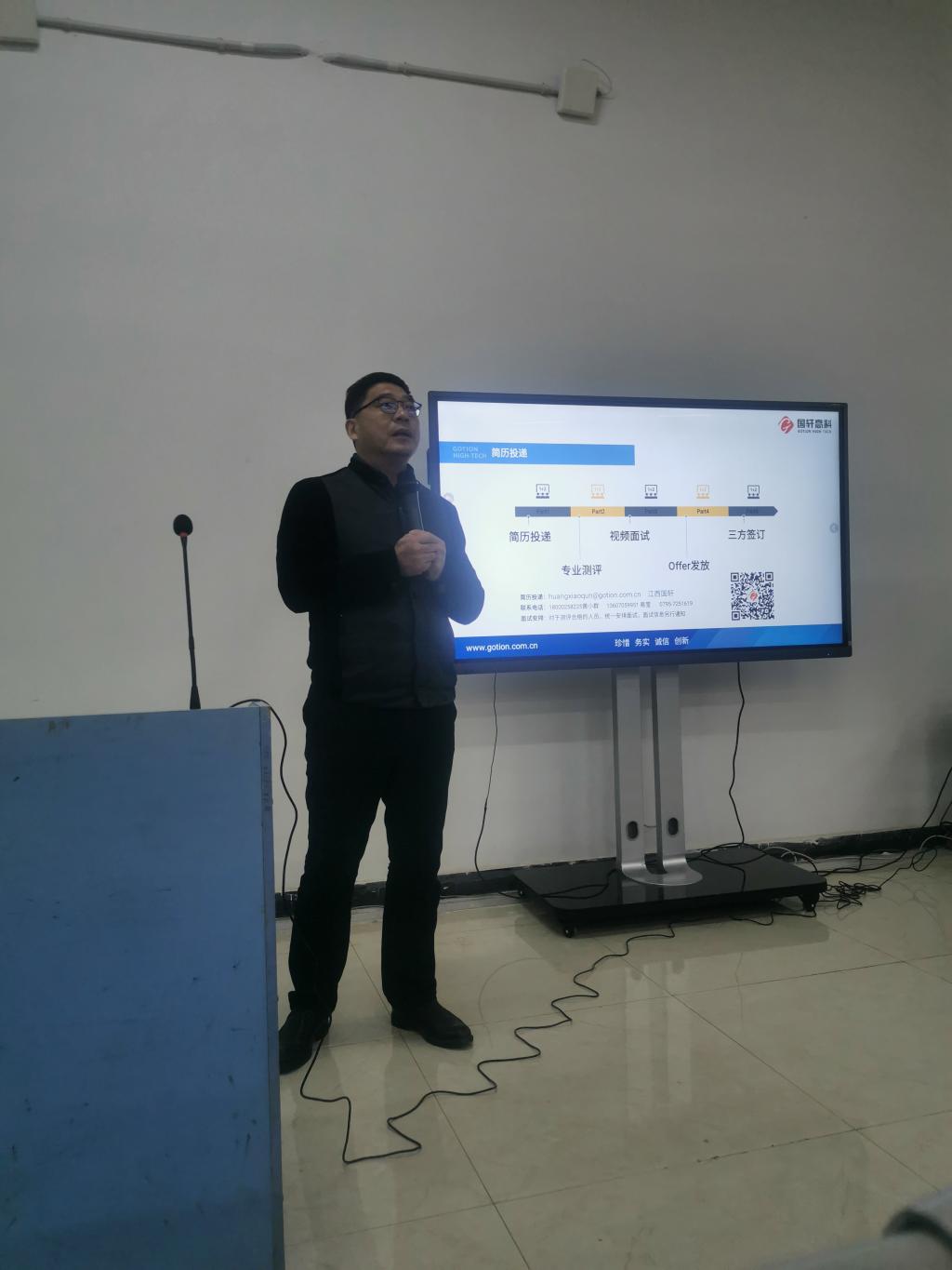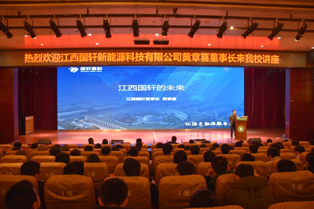 宣讲课上,江西国轩董事长黄章喜就锂电的基本知识、产业发展方向、五年发展规划及国轩人力资源计划四个方面宣讲课程,并向学生介绍了国轩的企业规模、企业业务、企业文化、薪资待遇和员工晋升机制等多方面内容,将国轩未来美好的发展形势描绘给同学们。黄章喜董事长用“技术型、专注型、国际化”三个词高度概括了国轩高科。目前国轩高科在全球建立七大研发平台和国际一流验证实验室,不断提升研发技术,大力吸收人才,并且专注于电池材料、电池制造和产品创造,坚持“产品为王”。同时国轩高科与大众集团进行合作,迈出了国轩走向世界的第一步。