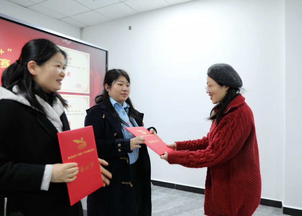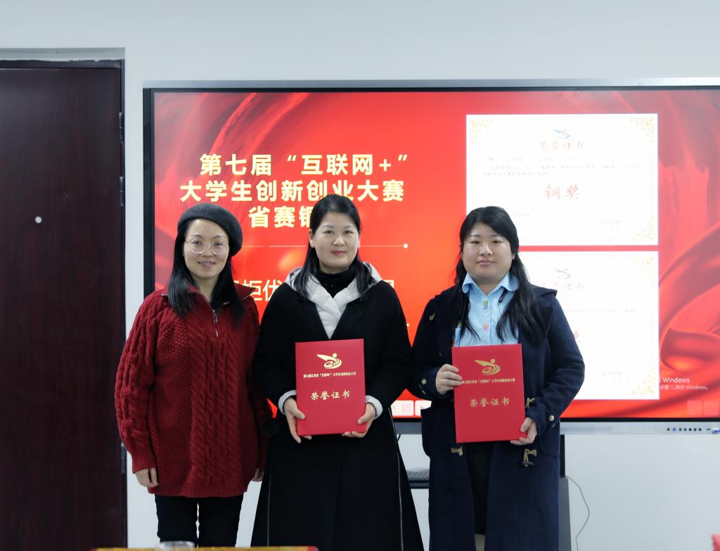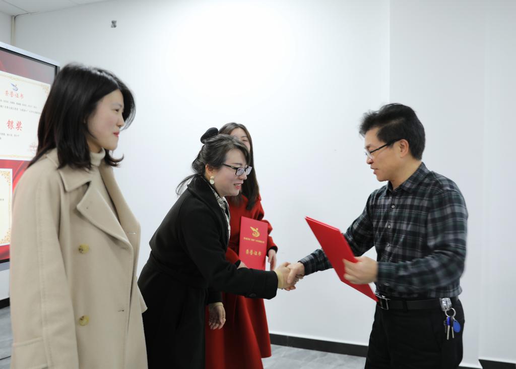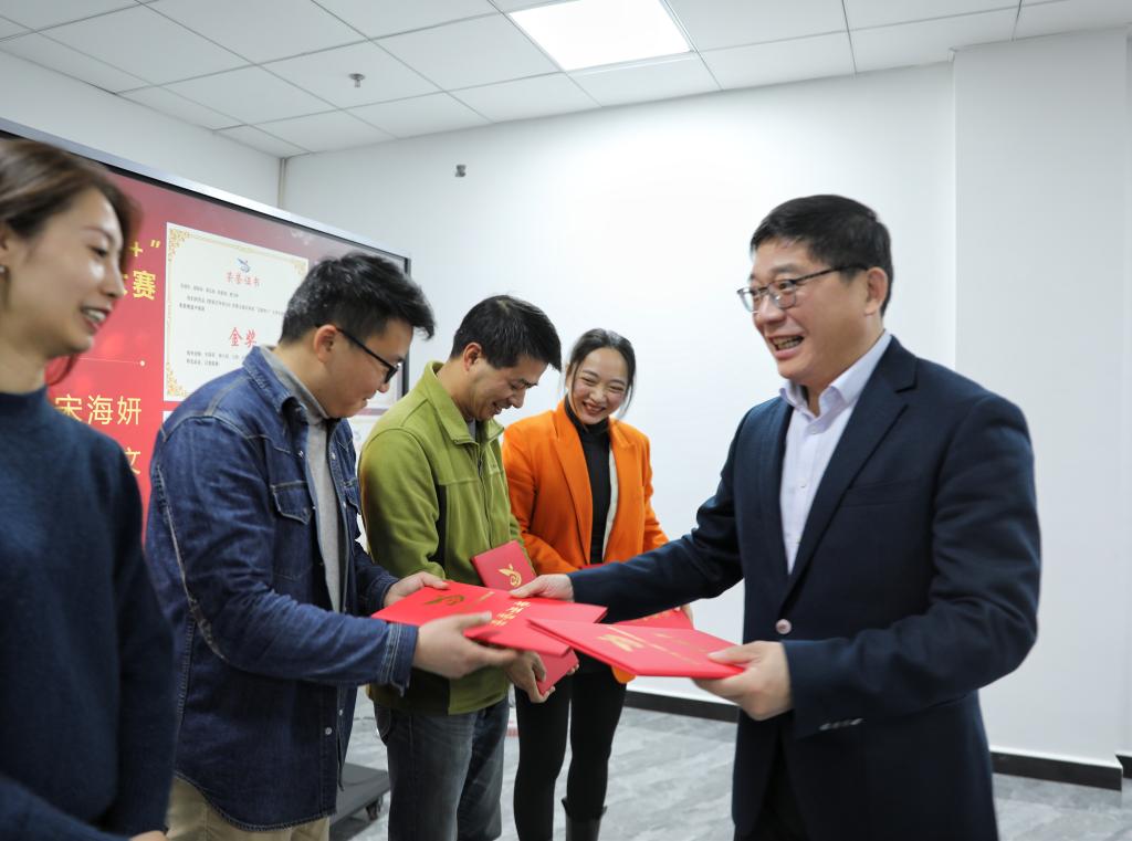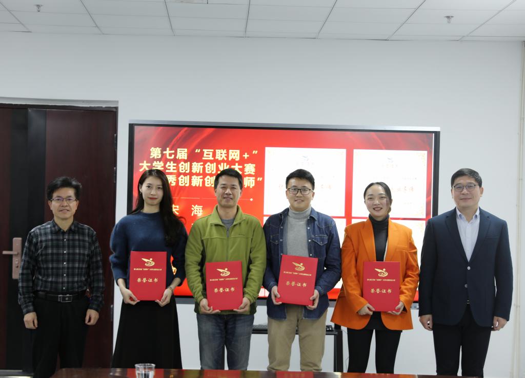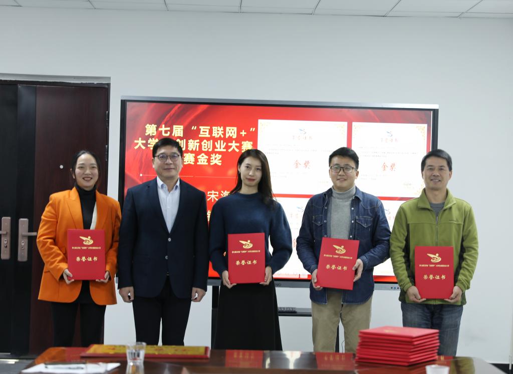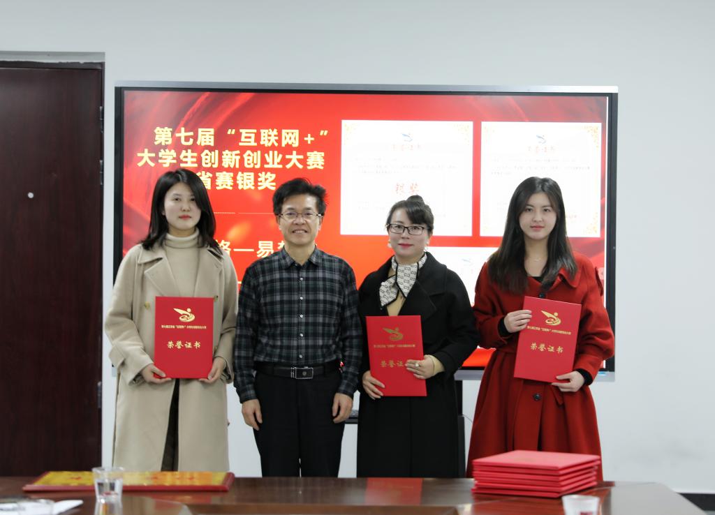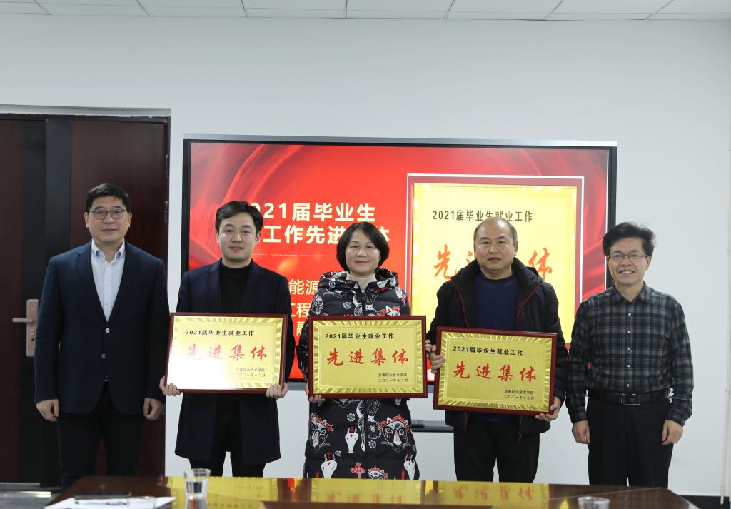 会上,任军宣读了学校2021年就业工作先进集体以及2021年“互联网+”大学生创新创业大赛获奖名单,任军、杨云山和易滨秀为获奖代表颁奖并合影留念。