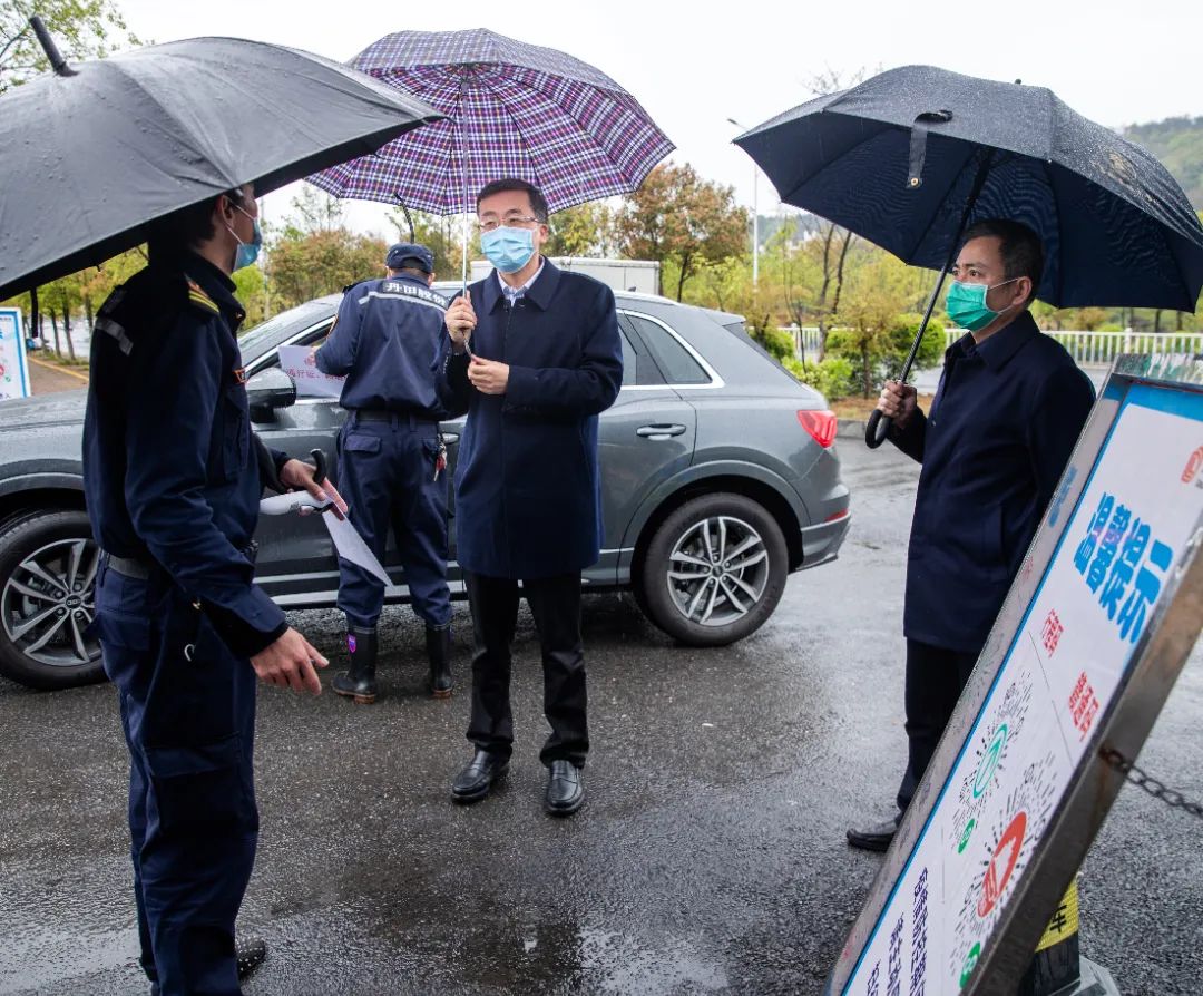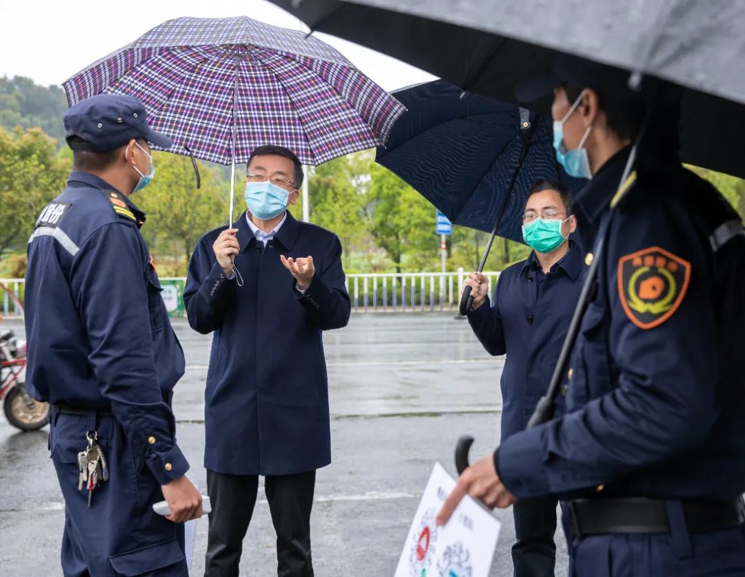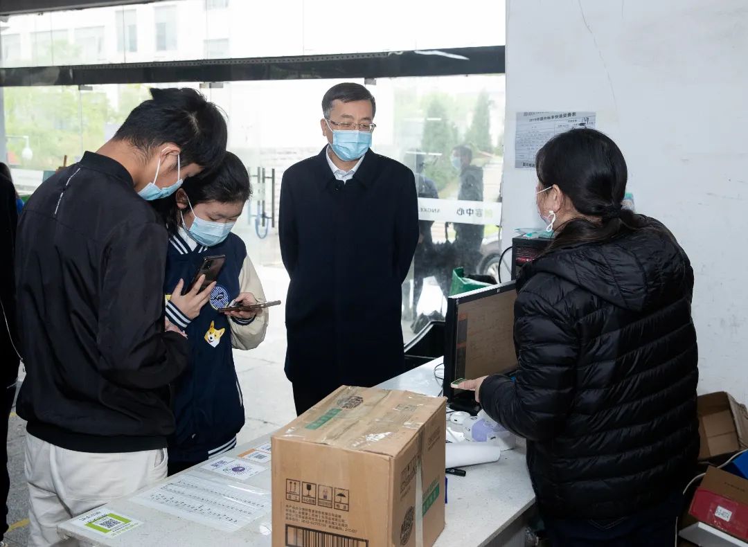 在新校区,邱军一行详细了解校园大门的疫情防控工作流程。当了解到进校需要佩戴口罩并扫健康码、行程码测量体温时,他表示,学校大门是疫情防控的第一道关口,一定要严格把控好,要严格按照要求落实落细。