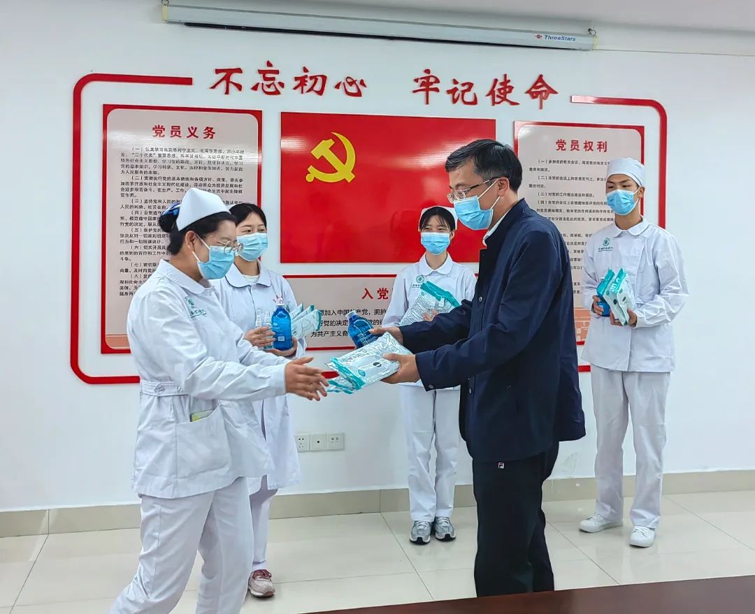 本站讯(护理学院 胡蓉 张蔺珊)5月12日是第111个国际护士节,恰逢全国职业教育活动周,校党委书记任军,副校长刘军,党委委员、宣传部部长邓伟蓉率领护理学院领导班子成员来到新校区德济楼A403教室慰问参加全国职业院校大赛竞赛集训的选手与指导老师们,向参加集训的师生致以节日的祝福。