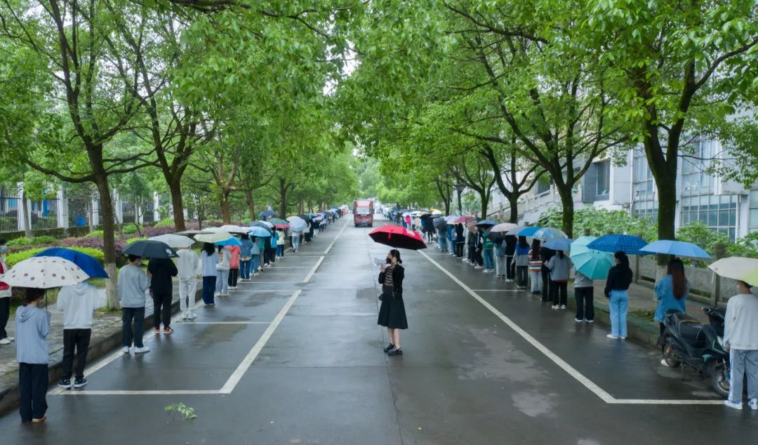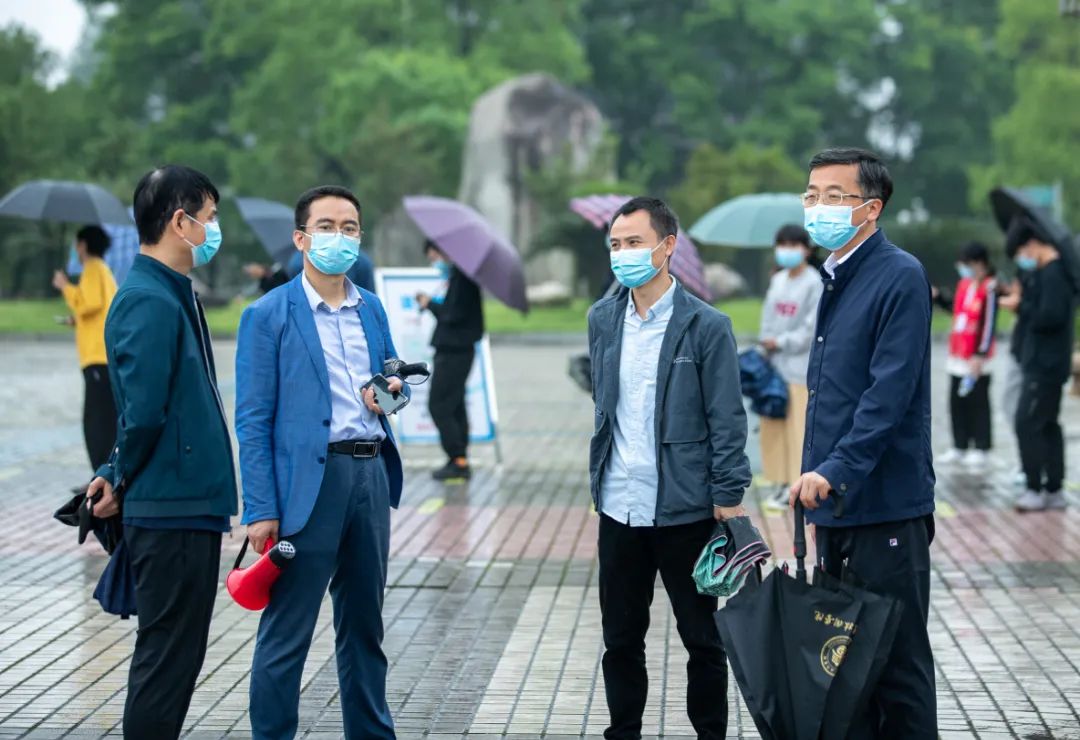校领导高度重视,党委书记任军,党委副书记、校长邱军等来到现场查看检测工作情况。检测前,校领导还多次携相关部门负责人踩点,反复论证检测地点、学生行进路线等事宜。由于检测当天气温较低且伴有小雨,为保障学生身体健康,邱军提出了“123”工作方针,即“不漏一人”,通知要精准、组织要精细,做到不漏检一人;“做好两戴(带)”,提醒学生戴口罩、带雨伞,做好个人防护;“要求三不”,学生在检测过程中不穿短袖、不穿短裤、不穿拖鞋,确保学生不因气温过低引发感冒。