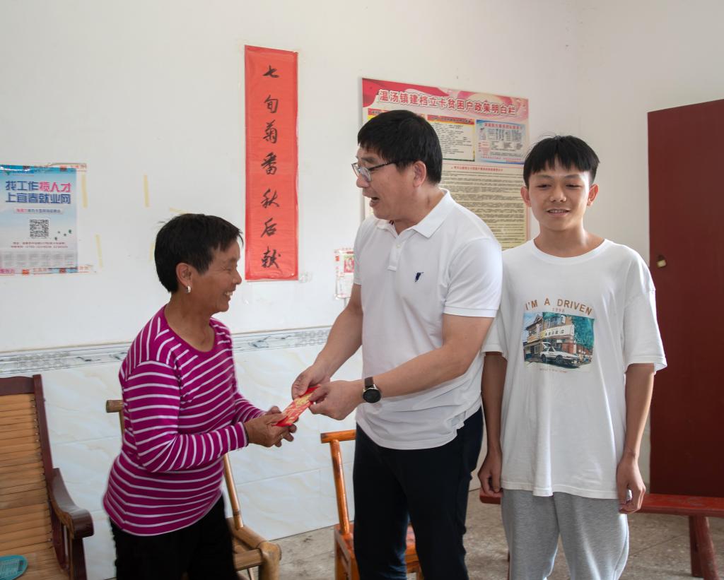车辆蜿蜒曲折一路前行,终于到达张龙源家中,旁边没有几户住户,映入眼帘的是一栋由政府帮忙修建的小平层。张龙源的奶奶热情的将任军一行迎入屋内,任军与老人亲切交谈,询问有什么需要帮助,让老人放心学校一定会保障学生顺利完成学业。同时,也勉励学生要敢于吃苦,不断磨练自己,积极锻炼,提升本领,通过知识改变命运,成就自我,反馈社会。随后,任军给学生送上慰问金和慰问品。