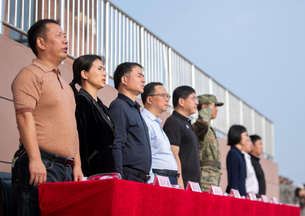 任军向承训部队教官授荣誉旗,向全体军训教官表达敬意和感谢。