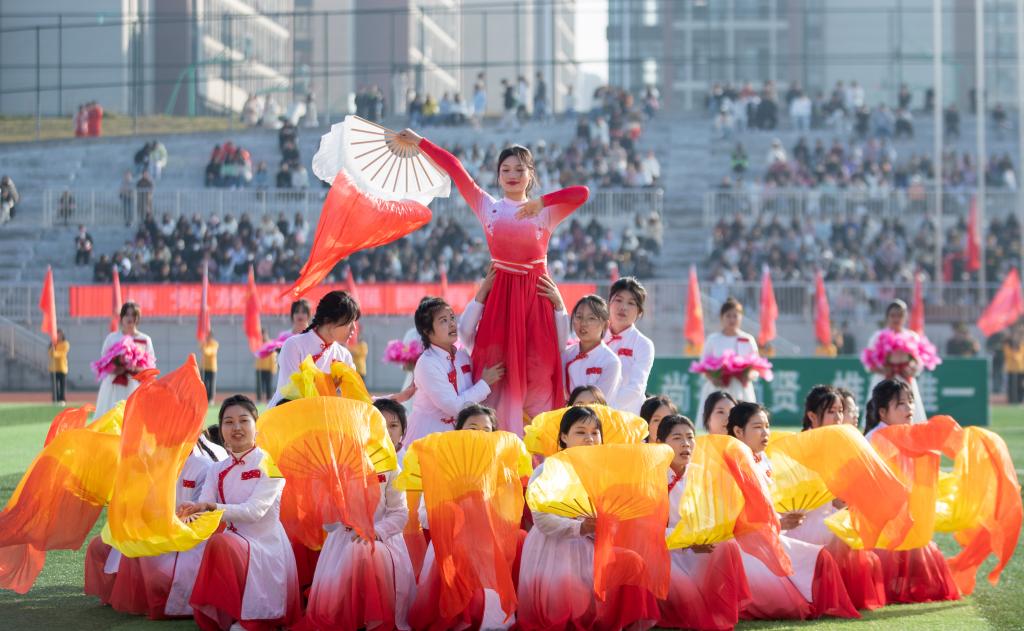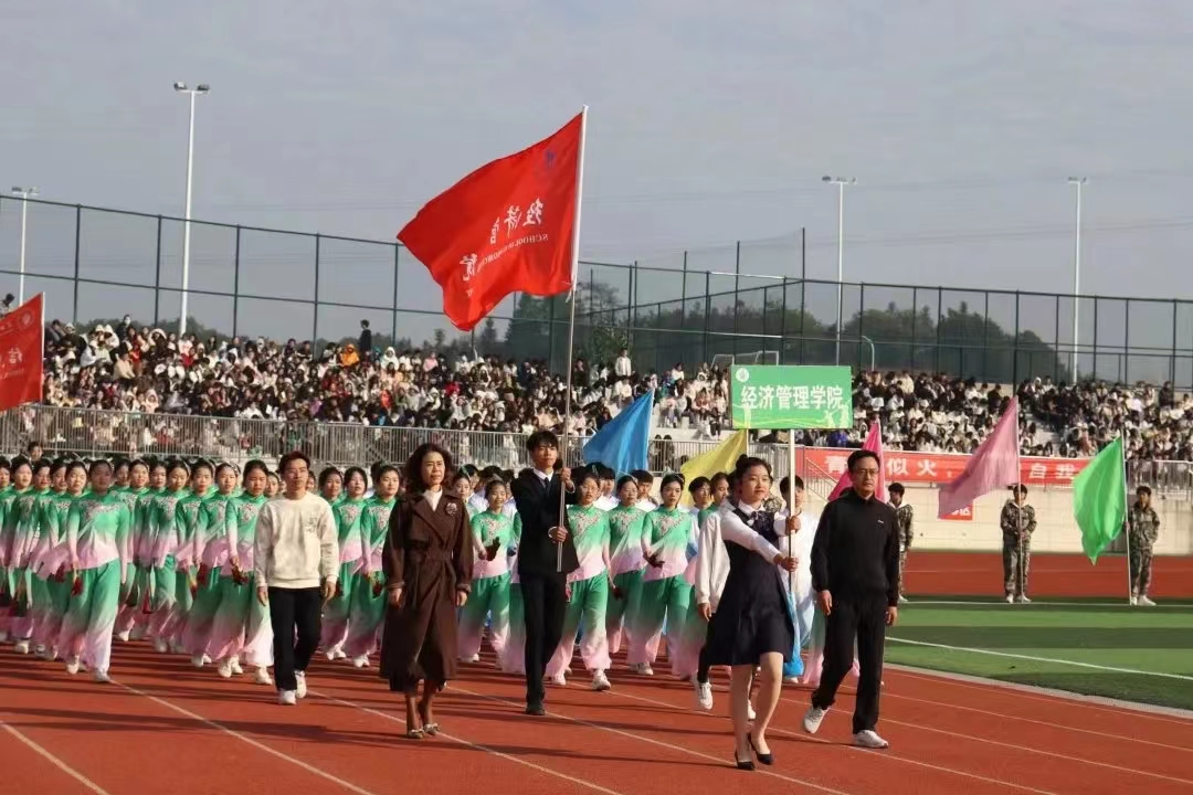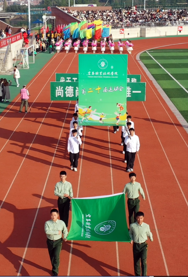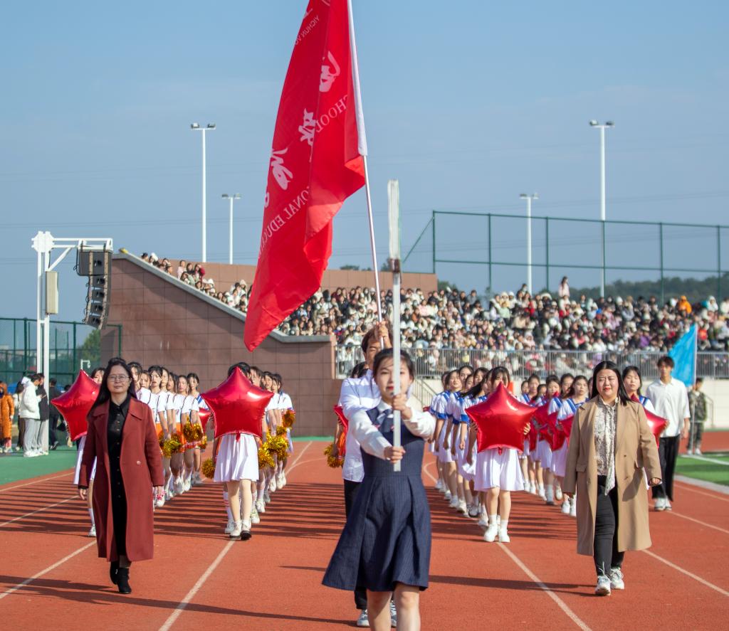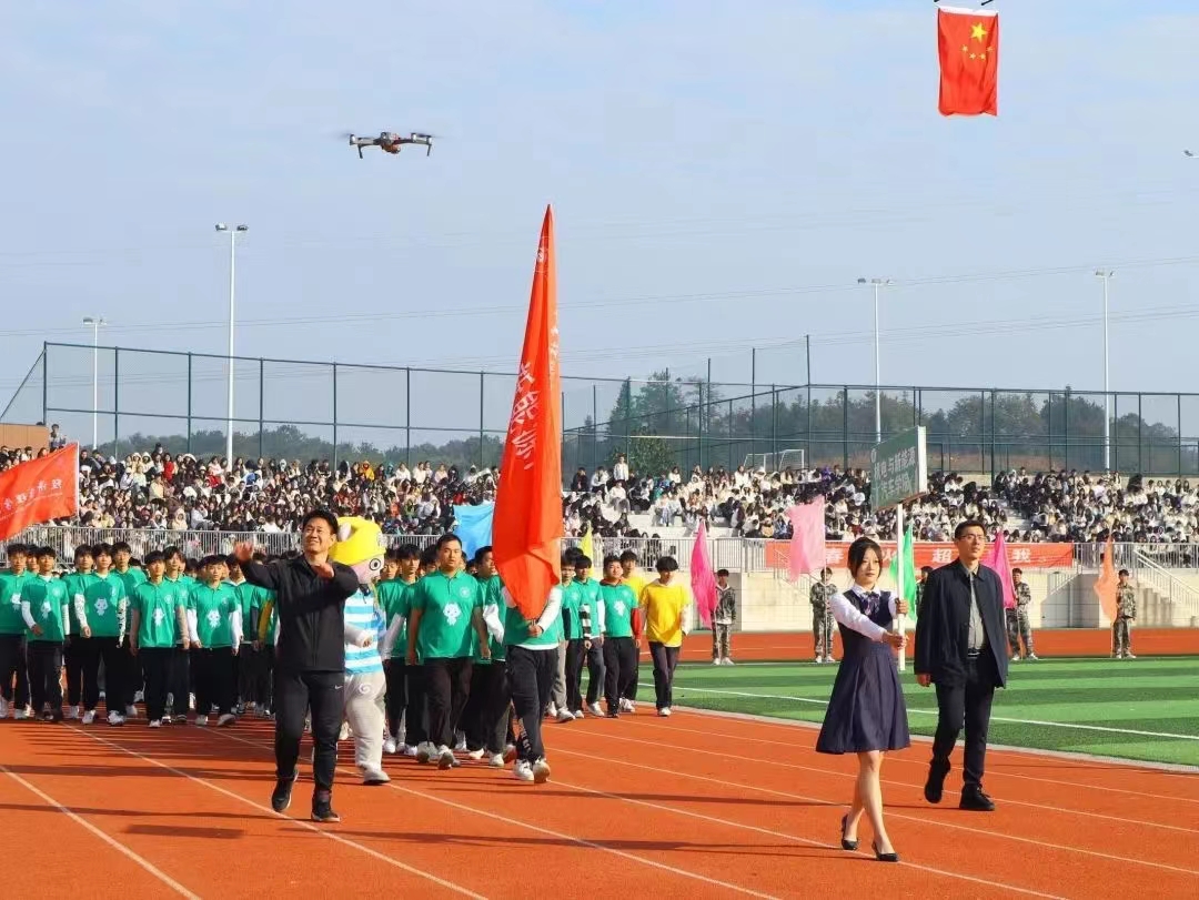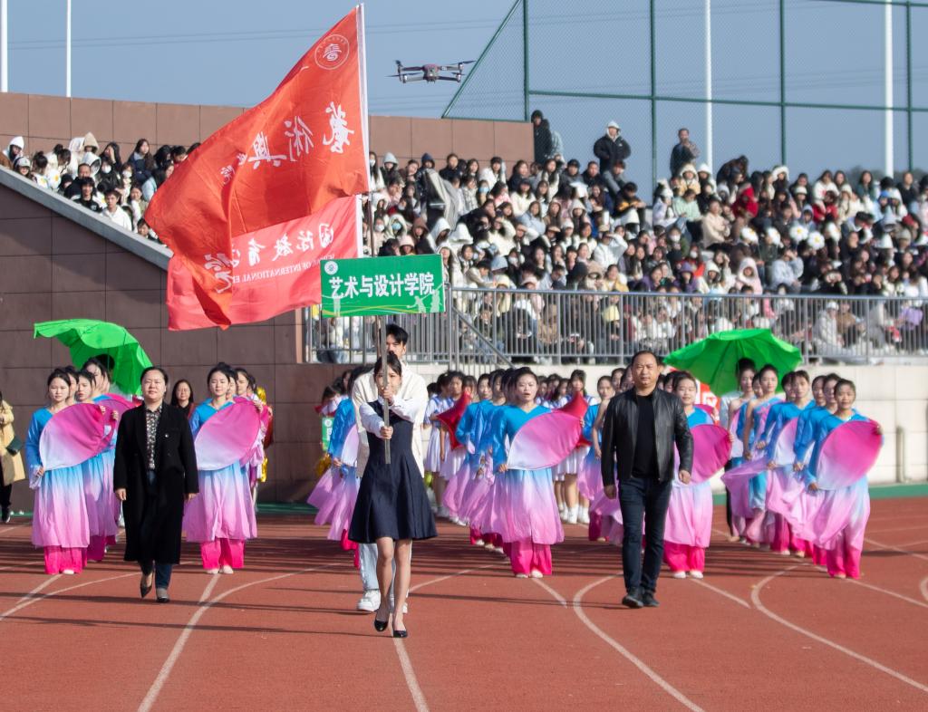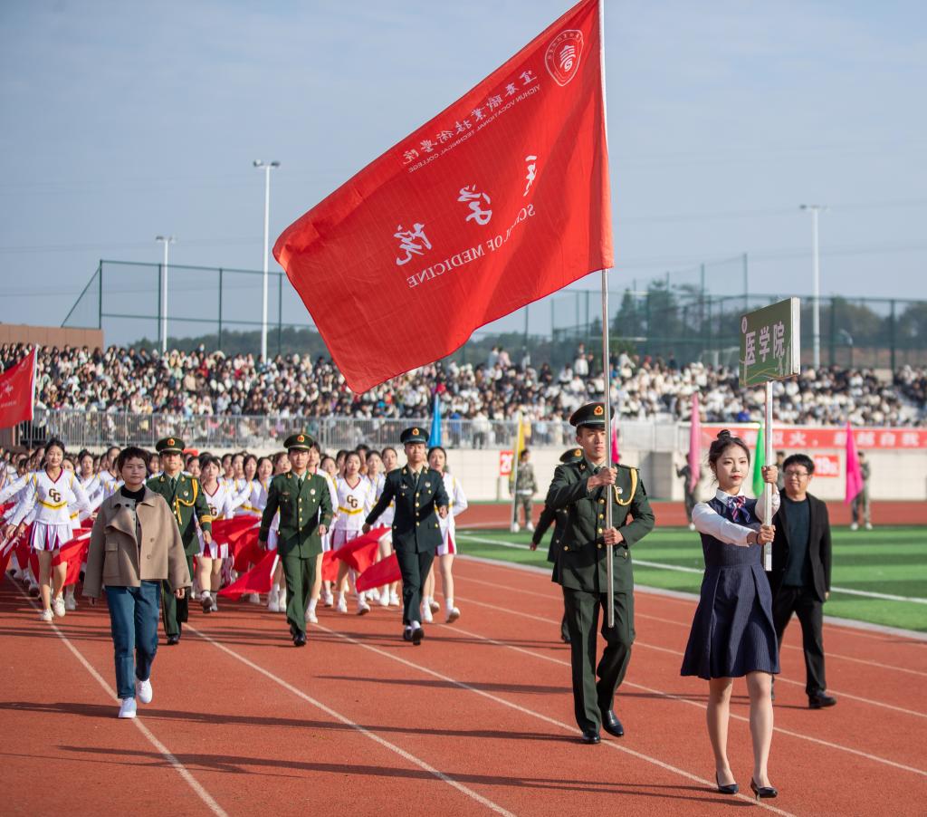 紧接其后的是各学院代表队。护理学院代表队手拿红黄两色绸扇,身穿渐变长裙,翩翩起舞;医学院代表队由身着戎装的退伍军人担当旗手,蓬勃朝气扑面而来;师范学院代表队撑着伞自信走来,如同园丁为花朵打伞,“四有好老师”风貌尽显其中;机电与新能源汽车学院代表队头顶飞翔着无人机,悬挂着五星红旗,喷射出彩色的烟雾;经济管理学院代表队身姿飒爽,绿色服装格外吸睛;信息工程学院代表队手持金花红花齐上阵舞动;艺术与设计学院代表队身姿婀娜,在粉与蓝丝绸的融合下如天鹅般曼妙起舞;国际教育学院代表队手持金花,热情似火……各个学院的入场表演各具特色,铿锵有力的口号和坚定不移的脚步展示出了他们必胜的决心。