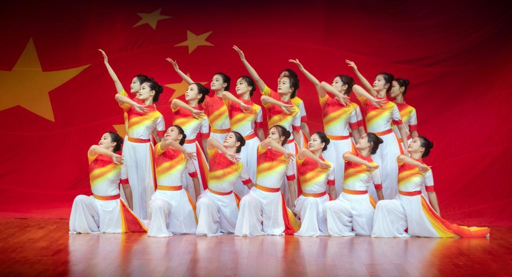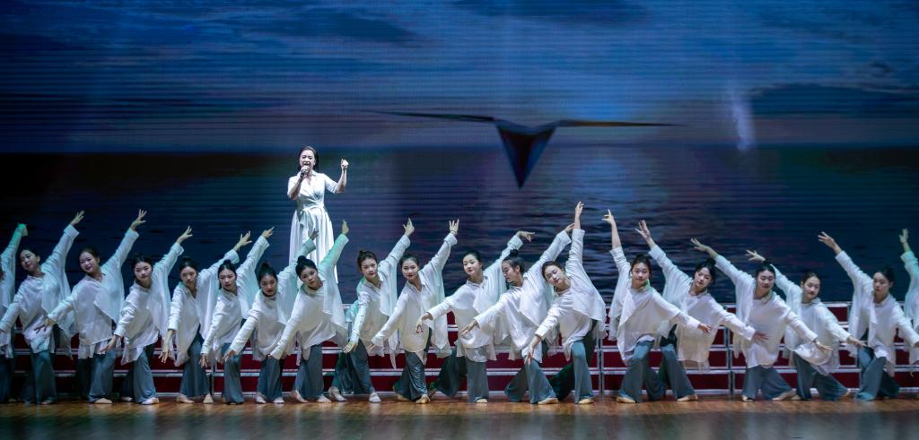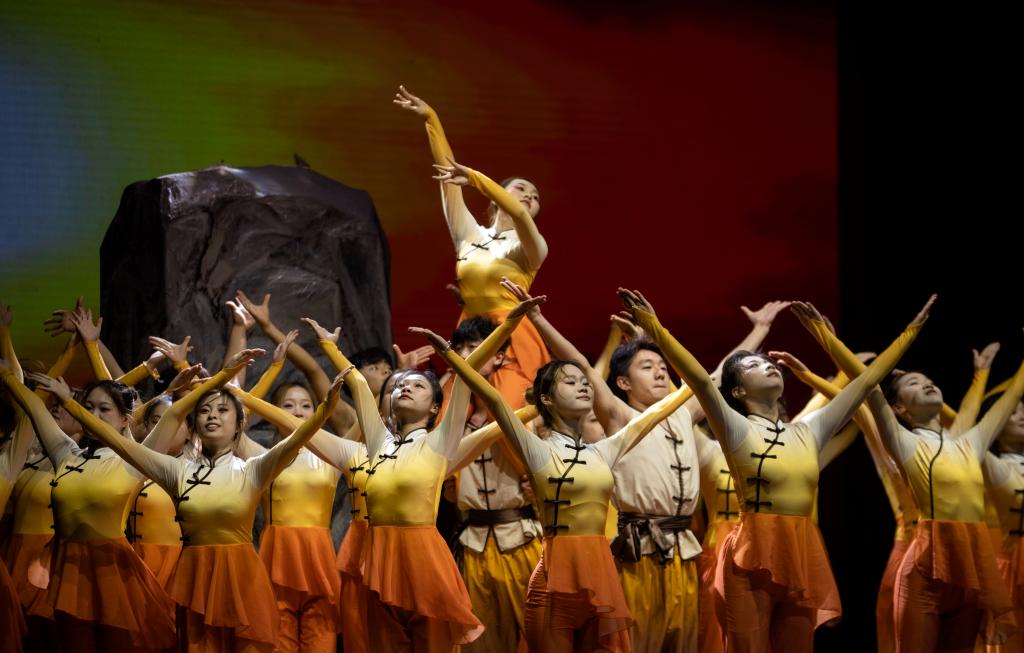伴随铿锵有力的歌声,演出者们旋转聚合,执手前行、向上攀登。《歌舞》负重前行生动演绎建校之初的困难时刻,师生们攻坚克难、迎难而上的场景。