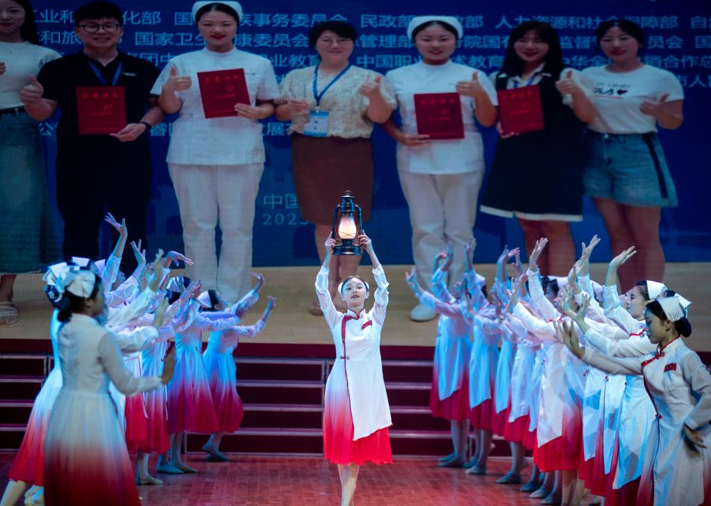 歌舞《连冠之誉》立体展现开云官网享有“四度摘得全国职业院校技能大赛桂冠”之誉的护理专业学子奋斗夺冠、逐梦追光的场景。舞台上,高举的护理之灯,燃放着信仰的光芒,照亮前行的方向。