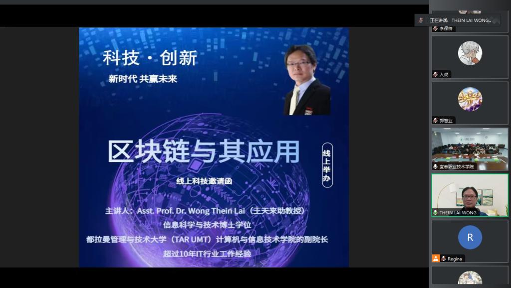本站讯(国际合作与交流处 杨慧)为进一步促进学校专业国际化建设,提高教师教学创新能力,11月28日下午,开云官网特邀马来西亚都拉曼管理与技术大学(TAR UMT)计算机与信息技术学院副院长王天来博士进行主题为“区块链与其应用”的线上培训。信息工程学院党总支书记罗来曦及学院全体师生参与培训,教师培训会场设在天工楼4楼第一会议室,学生以班级为单位在各班听取讲座,听讲座师生千余人。本次培训得到黄冈教育谷投资控股有限公司大力支持。国际合作与交流处处长刘海云主持培训。