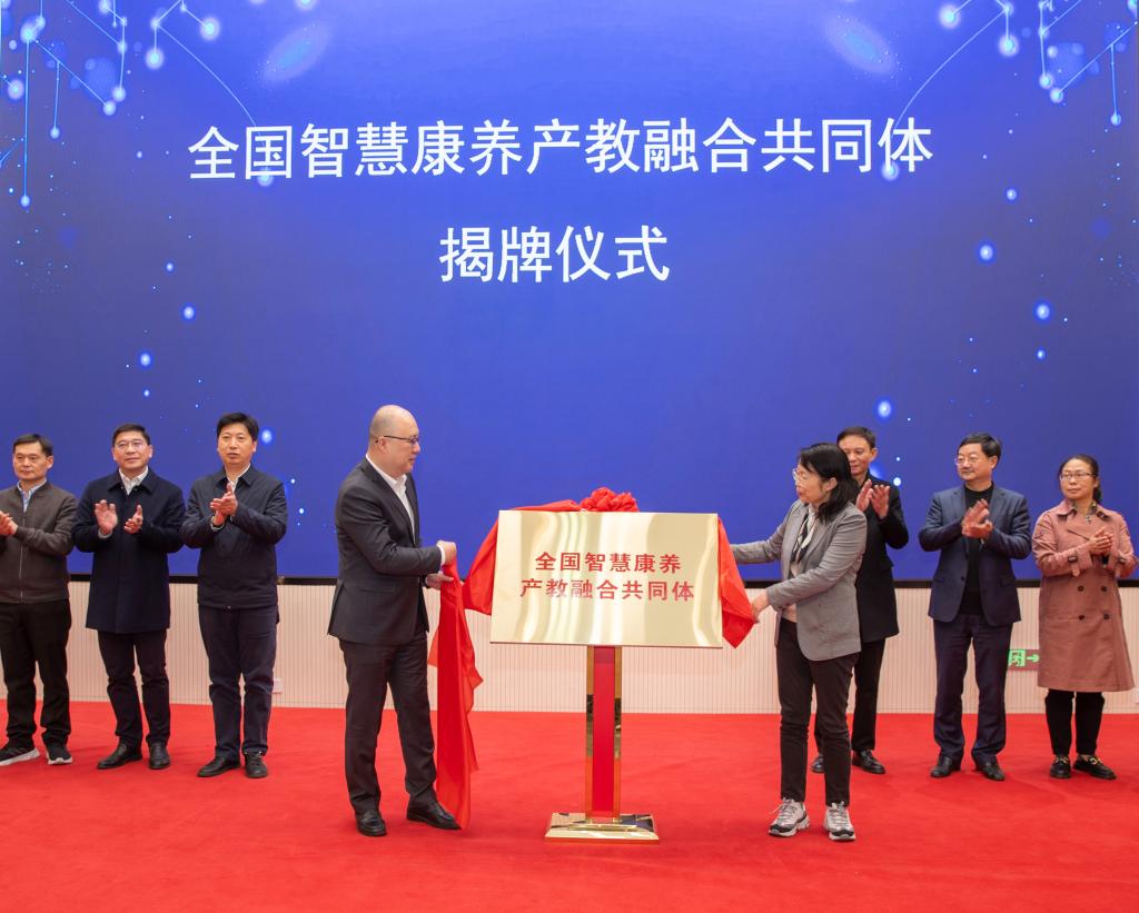 会上,杨春年、吴文多共同为全国智慧康养产教融合共同体揭牌。
