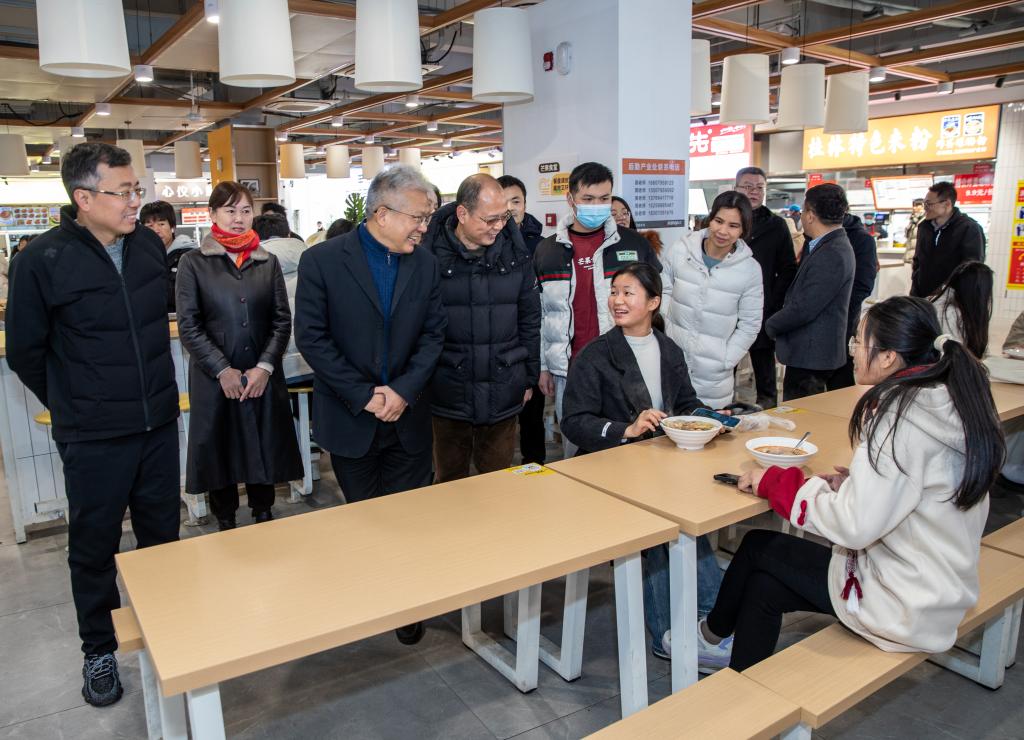 “学校食堂伙食好不好?”“食堂价格怎么样?一个月伙食费大概多少?……”汪立夏来到食堂同学生亲切交谈,询问饭菜质量、口味、价格以及服务等问题,关心同学们日常生活起居。现场边查看就餐环境、档口管理等情况,边听取学校关于食堂管理和食品安全管理等方面工作汇报。