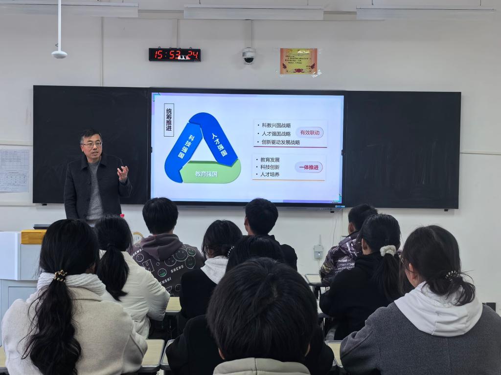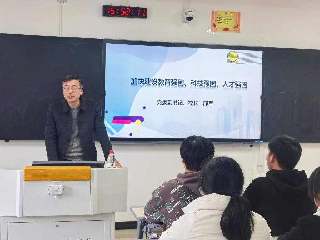 本站讯(护理学院 曲晴)为进一步加强大学生思想政治教育,落实立德树人根本任务,1月4日,党委副书记、校长邱军为护理23301班的同学们带来一堂主题为《加快建设教育强国、科技强国、人才强国》的形势与政策课。