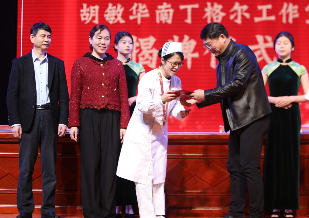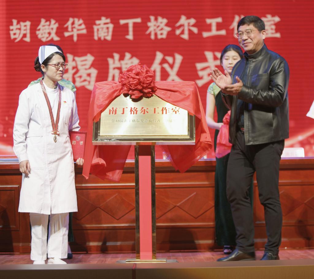 在揭牌仪式上,任军与胡敏华共同为“胡敏华南丁格尔工作室”揭牌,任军为胡敏华颁发证书。