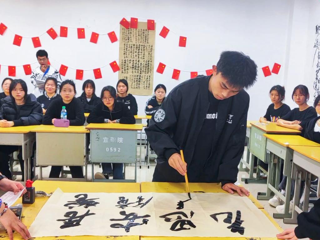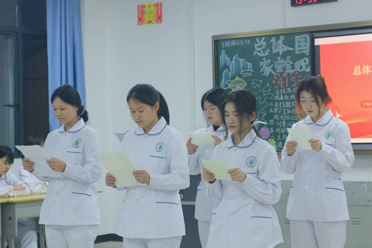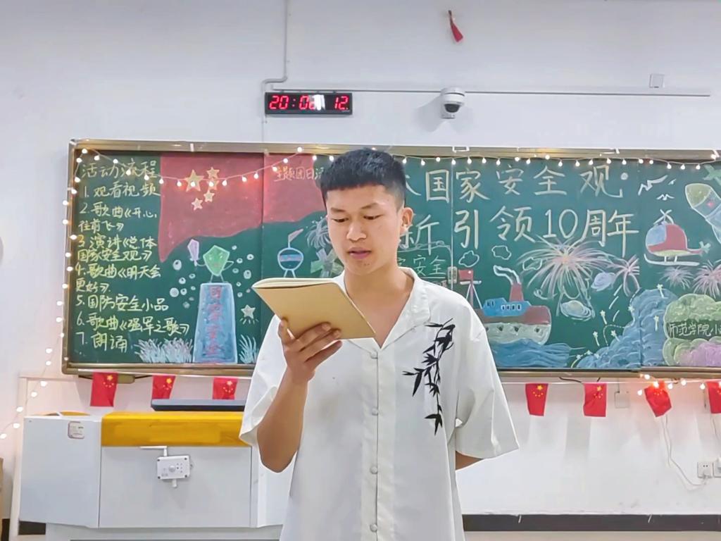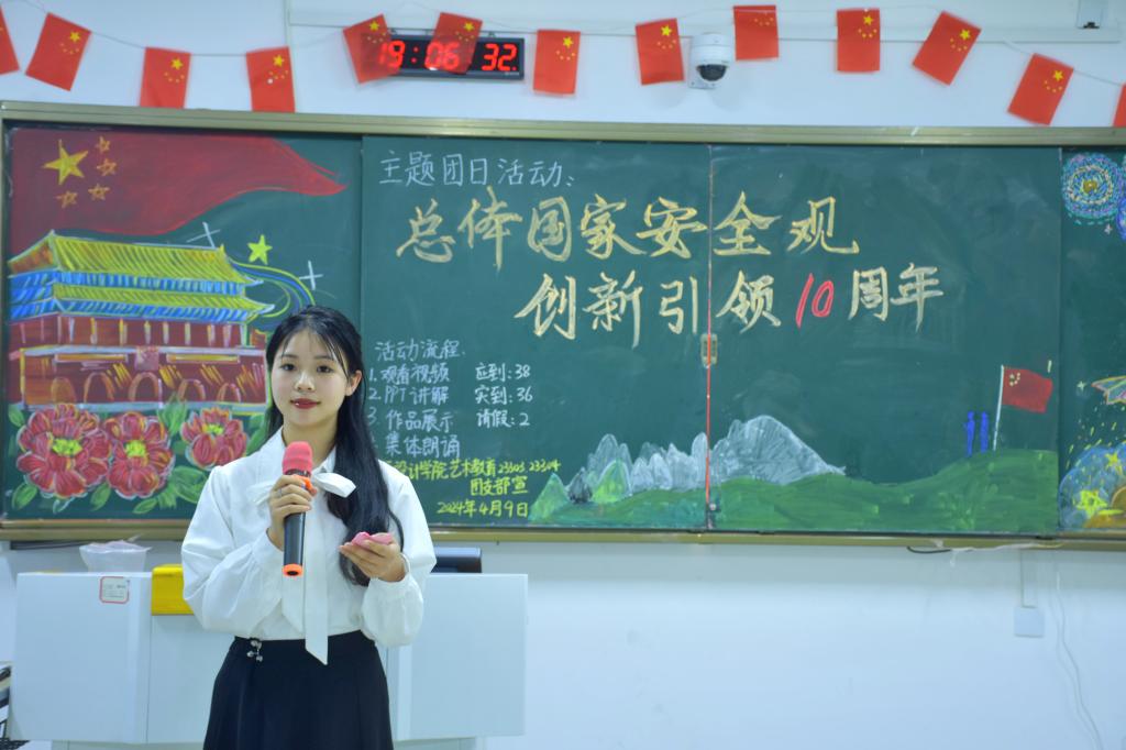 此外,各二级学院团支部也通过诗歌朗诵、情景剧演绎、案例分享、大合唱等形式表达自己对此次活动的理解和感悟。师范学院同学们整齐划一的朗诵《国家安全,人人有责》,声音铿锵有力,每一个字都充满了对国家安全的坚定承诺和无限忠诚,展现出了她们为呼吁维护国家安全你应我共守的原则;国际教育学院通过开展《总体国家安全观》知识竞赛,为同学们提供了一个既充满教育意义又极具趣味性的学习平台,在这场别开生面的竞赛中,同学们不仅积极参与,更是展现出了他们对国家安全知识的深刻理解,也在轻松愉快的氛围中收获了宝贵的知识财富;艺术与设计学院将科普国家安全知识与艺术相结合,巧妙地将PPT讲解与书法专业技能相融合,不仅丰富了传统的书法教学内容,还为国家安全知识的普及注入了新的活力;信息工程学院与经济管理学院,采取了多元化的科普方式,通过朗诵、答题、互动和小组讨论等丰富多彩的活动形式,全面而深入地引导同学们树立防患于未然的意识;护理学院与医学院通过观看国家安全主题视频、举行主题朗诵活动以及聆听国家安全之歌等方式感悟安全教育的重要性,坚定他们作为未来医疗工作者应有的责任感和使命感,为他们将来更好地服务社会打下良好基础;机电与新能源汽车学院通过合唱和朗诵诗词等文化活动,引领同学们深入学习“国家安全”这一重要主题,不仅提升了同学们自身的文化素养,也加深了对国家安全重要性的理解,为他们成为国家的栋梁之才奠定了坚实的基础。
