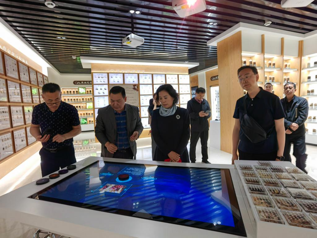 在中药科技馆,珍藏在玻璃罐中的2000余份中药标本丰富精美、琳琅满目,吸引众人驻足观赏。在医学院(附属医院)副院长胡振红的带领下,史梅一行逐一体验了全国中草药资源分布查询系统、AR中草药辨识教学平台、中医药VR虚拟仿真智慧平台等智能化教学系统,围绕场馆建设、专业教学展开交流。