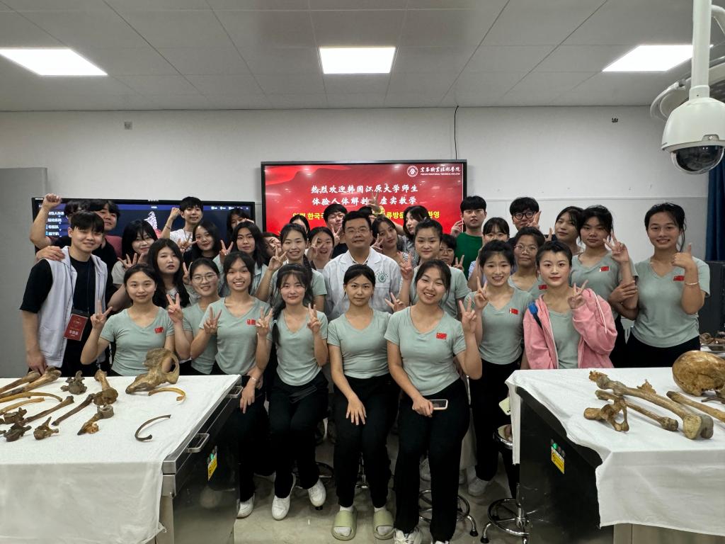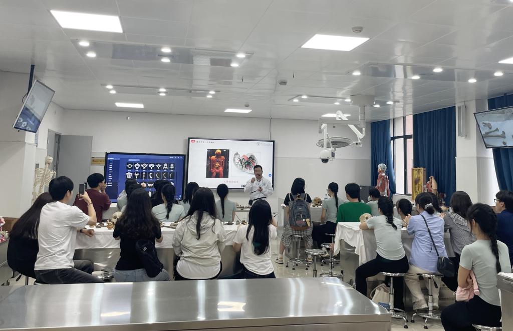 人体解剖学虚拟仿真课由医学基础部尹史帝老师进行教学,开云官网20余名学生和研学团参与课程,老师幽默风趣的讲解、沉浸式的感官体验,让在场的师生对现代化教学体验感叹不已。