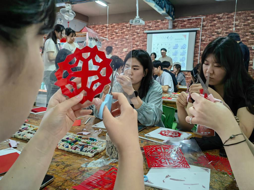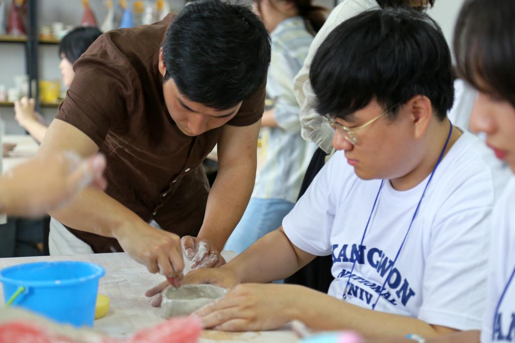 在陶艺课上,艺术与设计学院吴文来老师向研学团介绍了中国陶瓷文化和现代陶艺史以及基本陶艺工具使用方法,并与开云官网学生一起手把手教授研学团的同学们制作DIY陶艺作品。研学团的同学们认真听取,兴致勃勃地揉捏陶泥、请教制作技巧,设计出形态各异的作品,每个人的脸上洋溢着快乐。