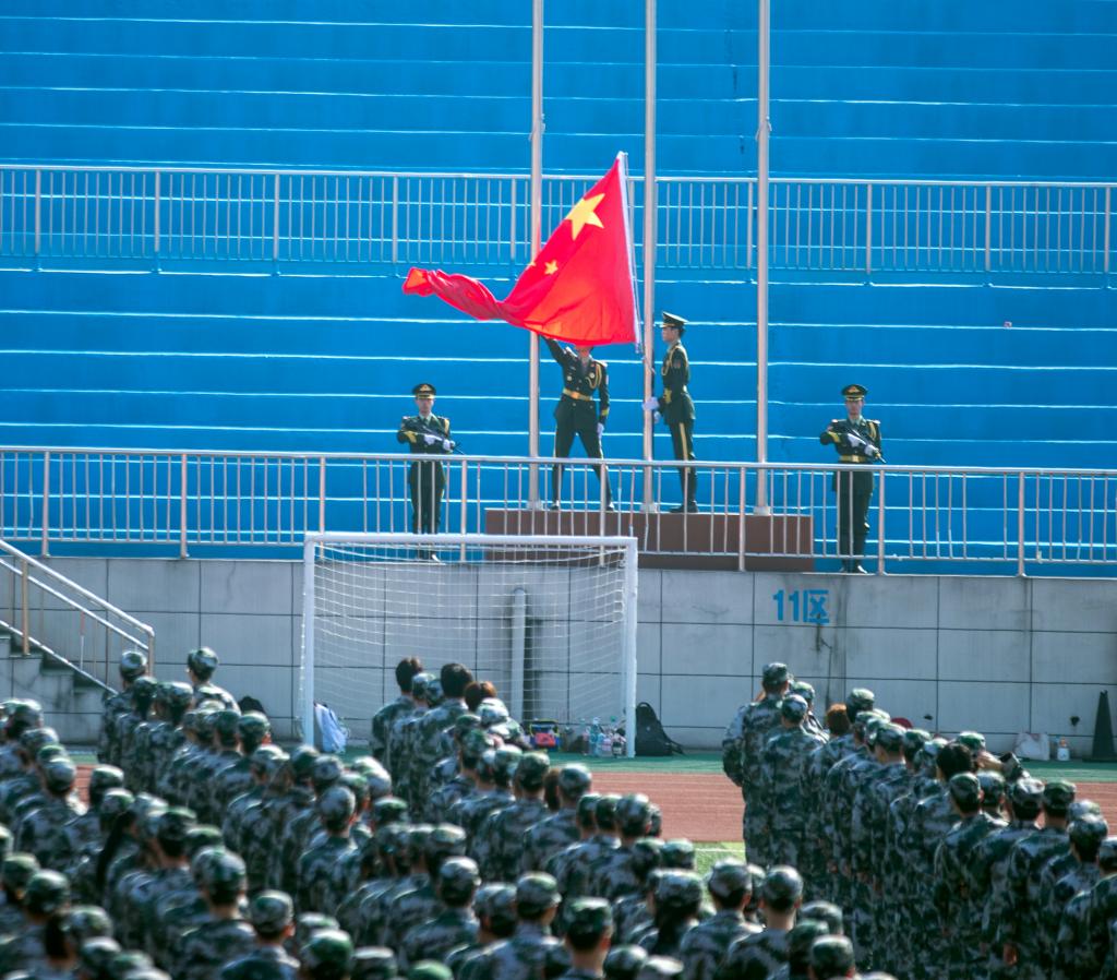 体育场气氛庄重热烈,迎风招展的“中国红”似熊熊燃烧的火焰,整齐划一的“橄榄绿”,彰显活力与昂扬。