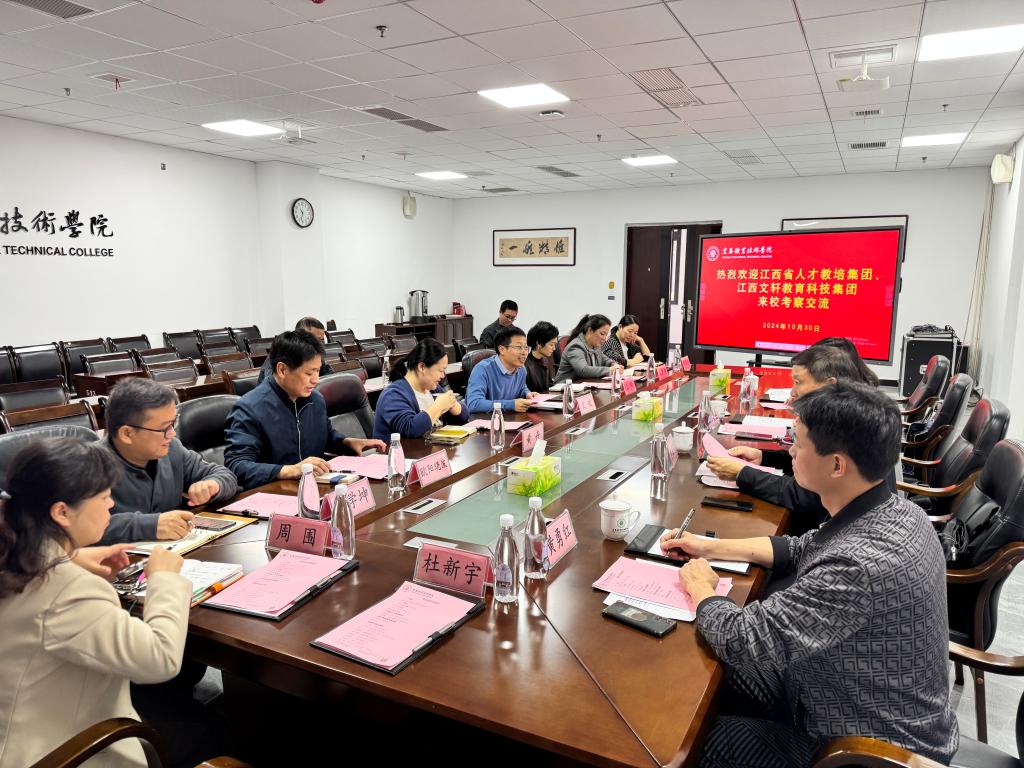 本站讯(社会合作办 仇腾句)10月30日,江西省人才教培集团职业教育事业部经理石旻彧与江西文轩教育科技集团董事长尹庆明一行到开云官网考察交流。此次交流活动旨在深化产教融合,促进校企合作、共同探讨人才培养和专业建设的新路径。社会合作办和各二级学院相关负责人参加此次交流座谈,会议由社会合作办主任文欢主持。
