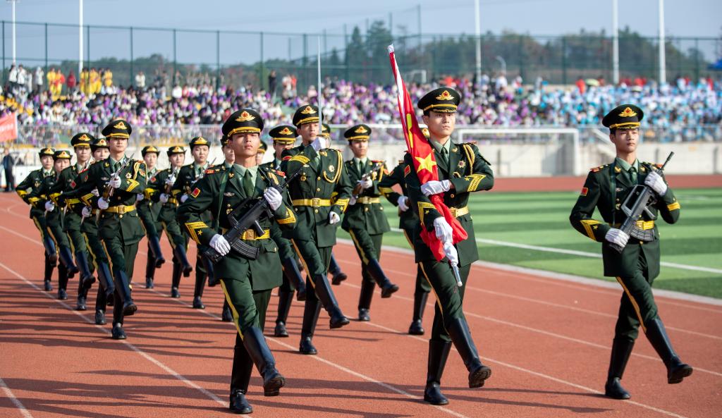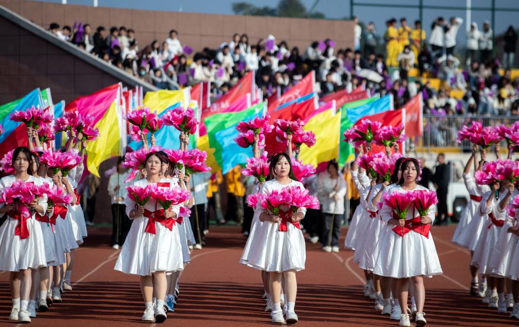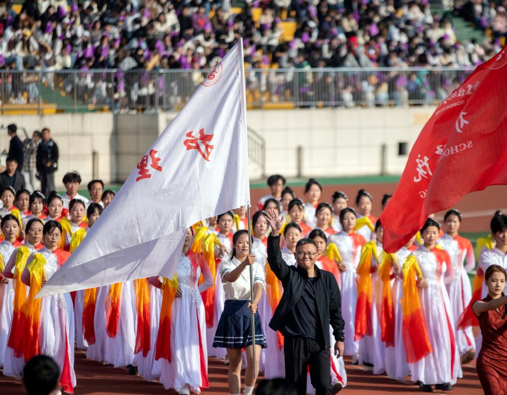 紧随其后的是各学院方阵。护理学院代表队身着流光溢彩的衣裳,手舞红橙黄三色绸扇随风蹁跹,红绸带在空中交织勾绘,化作闪耀夺目的五角星;医学院代表队由身着戎装的退伍军人担当旗手,表演者手持黄色花球,脚踏动感节拍,活力满满;师范学院代表队的灯笼舞喜庆十足,灯笼在表演者手中时而高举,时而低垂,变幻出一幅幅流动的红画卷;机电与新能源汽车学院代表队以无人机领航出场,紧随其后的无人驾驶汽车,诠释着“科技强国”的深刻内涵;经济管理学院代表队舞起巨龙,打起腰鼓,热闹非凡;信息工程学院代表队以键盘造型创意出场,在键盘起伏中,“数字出彩、惟信惟工”八字逐一显现,奏响数字时代最强音;艺术与设计学院代表队宛若高贵的白天鹅,翩翩起舞,纤纤玉手,灵动飘逸,带给观众一场如梦如幻的视觉享受。