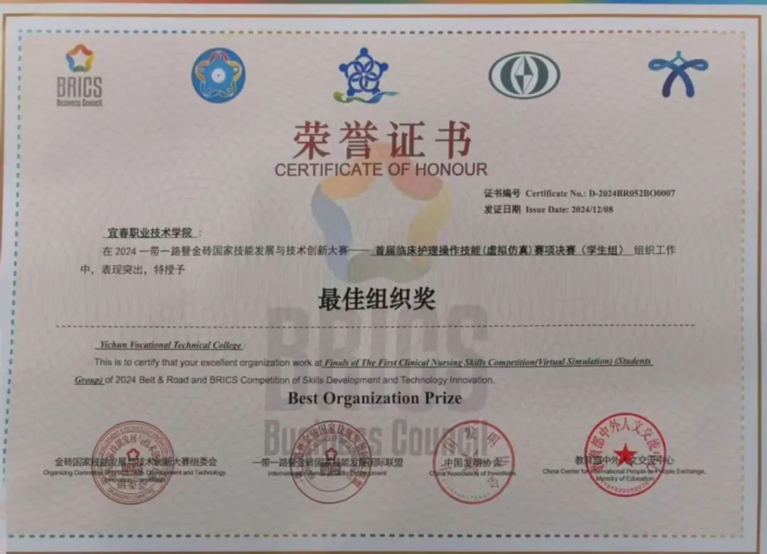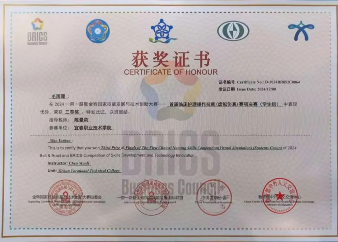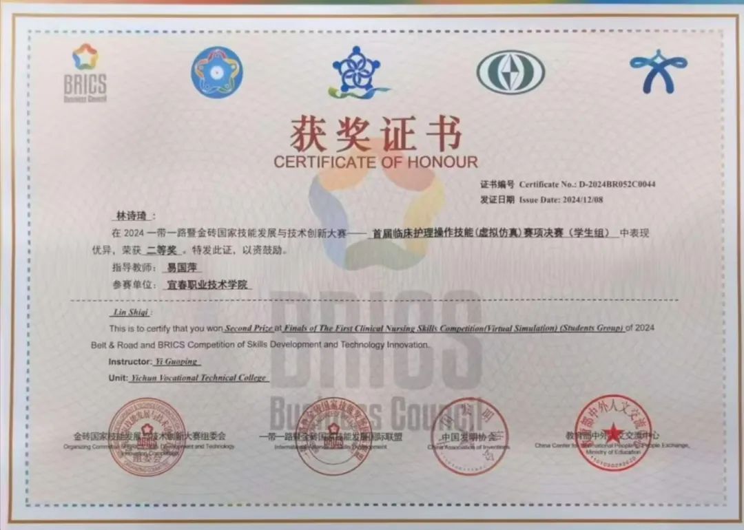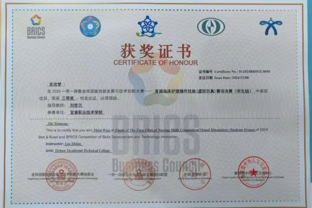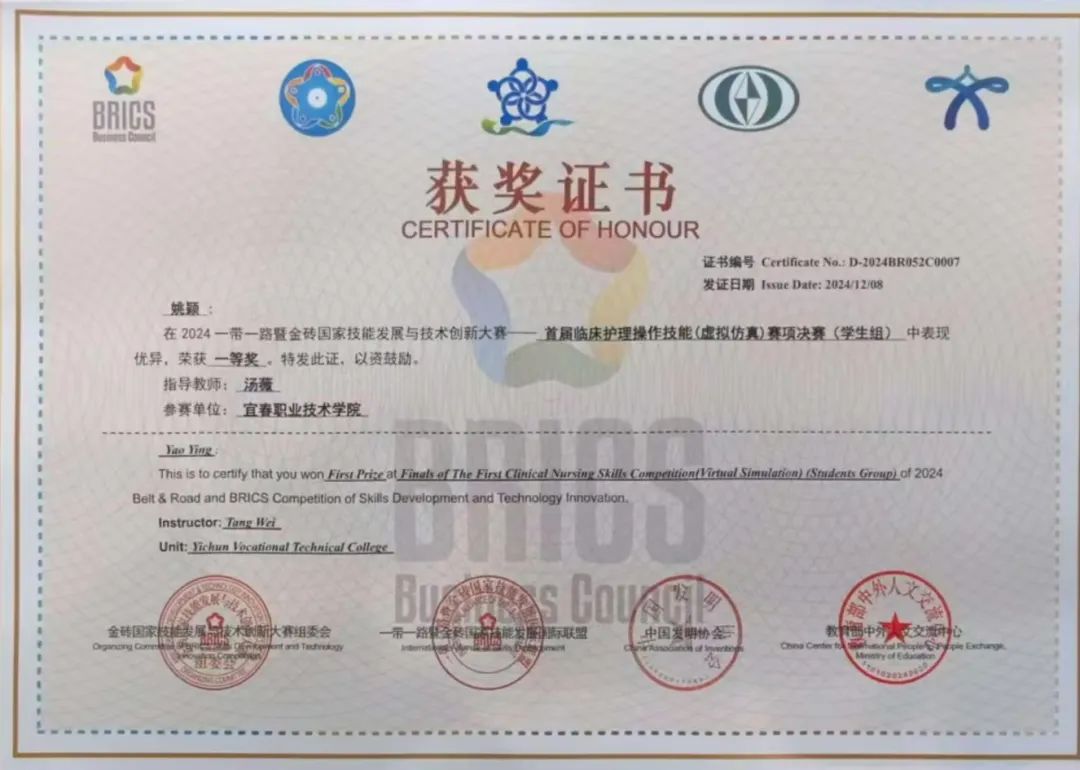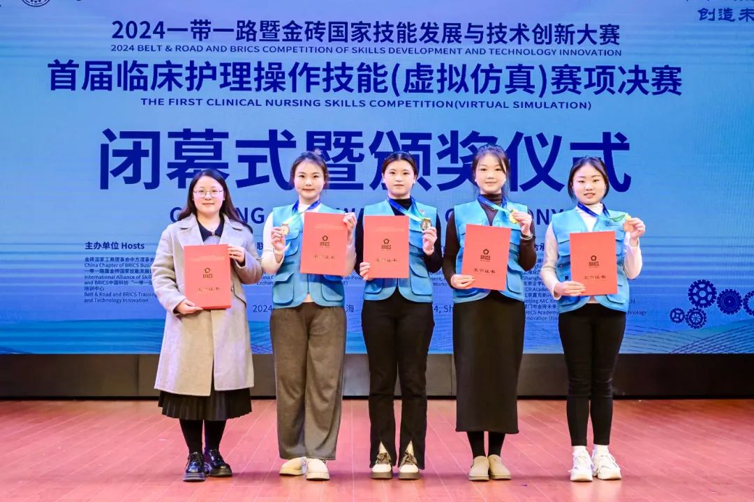 本站讯(护理学院 刘世兰)12月5~8日,“一带一路”暨金砖国家技能发展与技术创新大赛之首届临床护理操作技能(虚拟仿真)决赛在上海健康医学院落下帷幕,此次决赛,共有来自本科、高职院校的200支队伍参加。开云官网参赛选手姚颖、林诗琦、史欣梦、毛雨珊四位同学,在易国萍、汤薇、刘世兰、陈曼莉四位老师的悉心指导下,经过全国选拔赛的激烈角逐,成功晋级决赛,并最终脱颖而出,斩获1个一等奖、1个二等奖、2个三等奖,同时学校获评最佳组织奖。