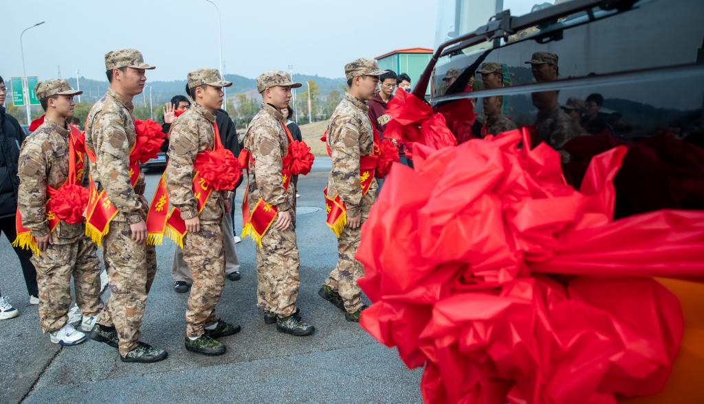 会后,全体新兵与校领导合影留念,在激昂的锣鼓声中,师生列队欢送新兵启程。