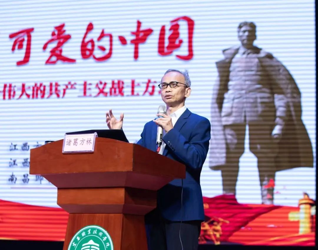 诸葛教授以《为了可爱的中国 —— 伟大的共产主义战士方志敏》为题,用生动鲜活的语言,带大家沉浸式回溯方志敏烈士的不凡人生。从少年方志敏目睹旧中国的沉疴,心底种下救国的种子,到他返回家乡,凭借非凡的勇气与智慧,领导九区暴动、年关暴动等革命行动,一步步勾勒出革命救国的清晰脉络。当话题转向方志敏以身殉国的悲壮事迹,现场氛围瞬间凝重起来。诸葛教授详细讲述方志敏在狱中艰苦条件下,仍坚守信仰,凭借钢铁般的意志创作出《可爱的中国》《清贫》等不朽篇章的感人故事。诸葛教授还分享了自己父亲被方志敏大义凛然形象所震撼的家族往事,让方志敏的形象从历史书页中跃然而出,变得更加立体鲜活。