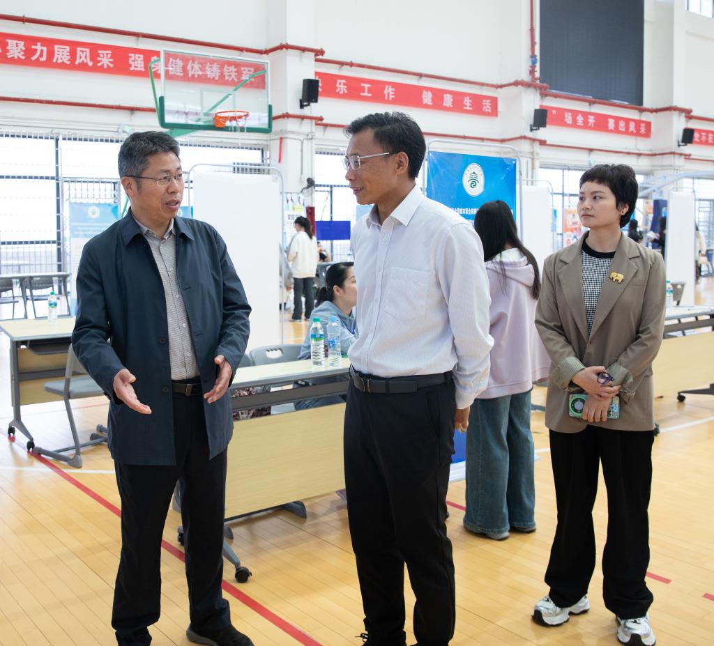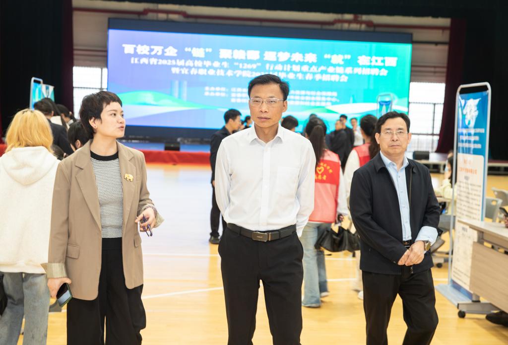 招聘会期间,宜春市就业创业服务中心主任李俊春现场调研指导,详细了解企业招聘需求与学生求职情况,对招聘会的组织与服务给予充分肯定,并提出建设性意见。