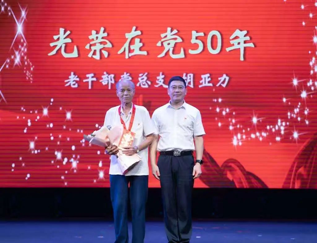 李铁刚宣读了《关于表彰优秀共产党员、优秀党务工作者和先进基层党组织的决定》。党委班子成员为2024年度“两优一先”荣誉称号获得者颁发荣誉证书。任军为“光荣在党50年”老党员胡亚力颁发纪念章、献花。
