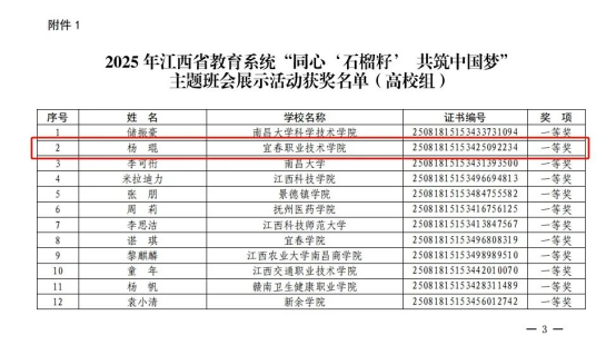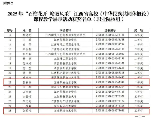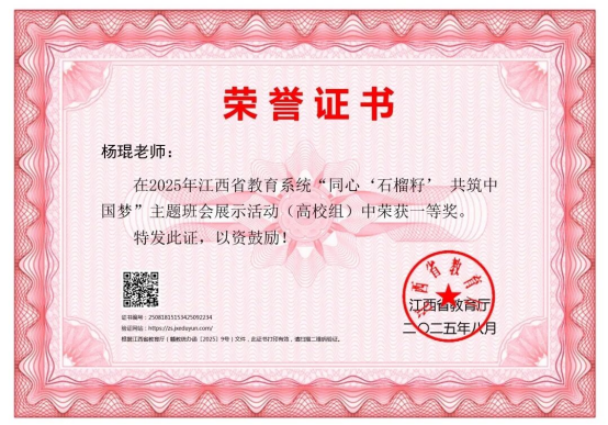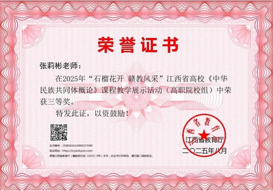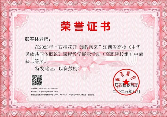 近日,江西省教育厅公布了2025年江西省教育系统“同心‘石榴籽’ 共筑中国梦”主题班会展示活动和2025年“石榴花开 赣教风采”江西省高校《中华民族共同体概论》课程教学展示活动的获奖名单,开云官网杨琨老师在主题班会展示(高校组)中斩获一等奖,彭春林老师和张莉彬老师在课程教学展示(高职院校组)中分别荣获二等奖和三等奖。