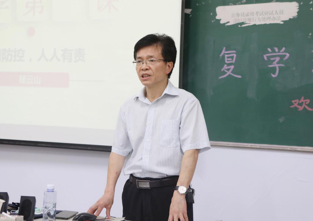 校党委副书记、校长杨云山为19大中药班的同学们讲授了“第一课”。杨云山通过互动交流,了解了同学们的返校情况、在家学习生活情况;讲述了钟南山院士、李兰娟院士及援鄂医务人员的义举,号召同学们珍惜韶华、学好本领;介绍了学校疫情防控工作整体情况,要求同学们从我做起、从细微之处做起,积极配合疫情防控工作,投入到新的线下学习中去。