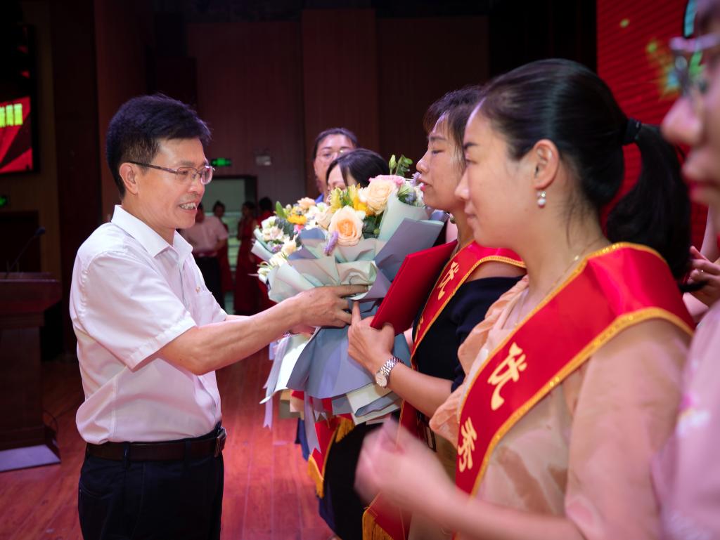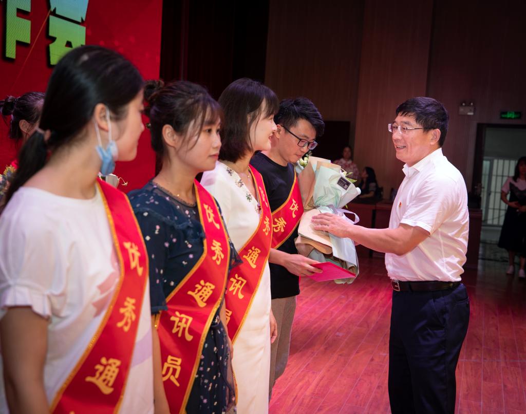 会议首先由杨云山宣读《关于表彰2019年度优秀通讯员的决定》。随后,任军和杨云山为朱建芳、潘睿琦、李珊等12位教师优秀通讯员颁奖,感谢他们为学校宣传与思想政治工作的辛勤付出。