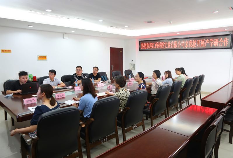 本站讯( 护理学院 易国萍)7月21日,江西科骏实业有限公司销售总监沈伟一行四人就老年服务与管理专业、国家职业教育虚拟仿真示范实训基地“老年照护实训VR项目开发”产学研合作进行交流。学校党委委员、副校长易滨秀,实习就业处副处长万发瑞、护理学院党总支副书记易国萍及相关人员出席座谈会。