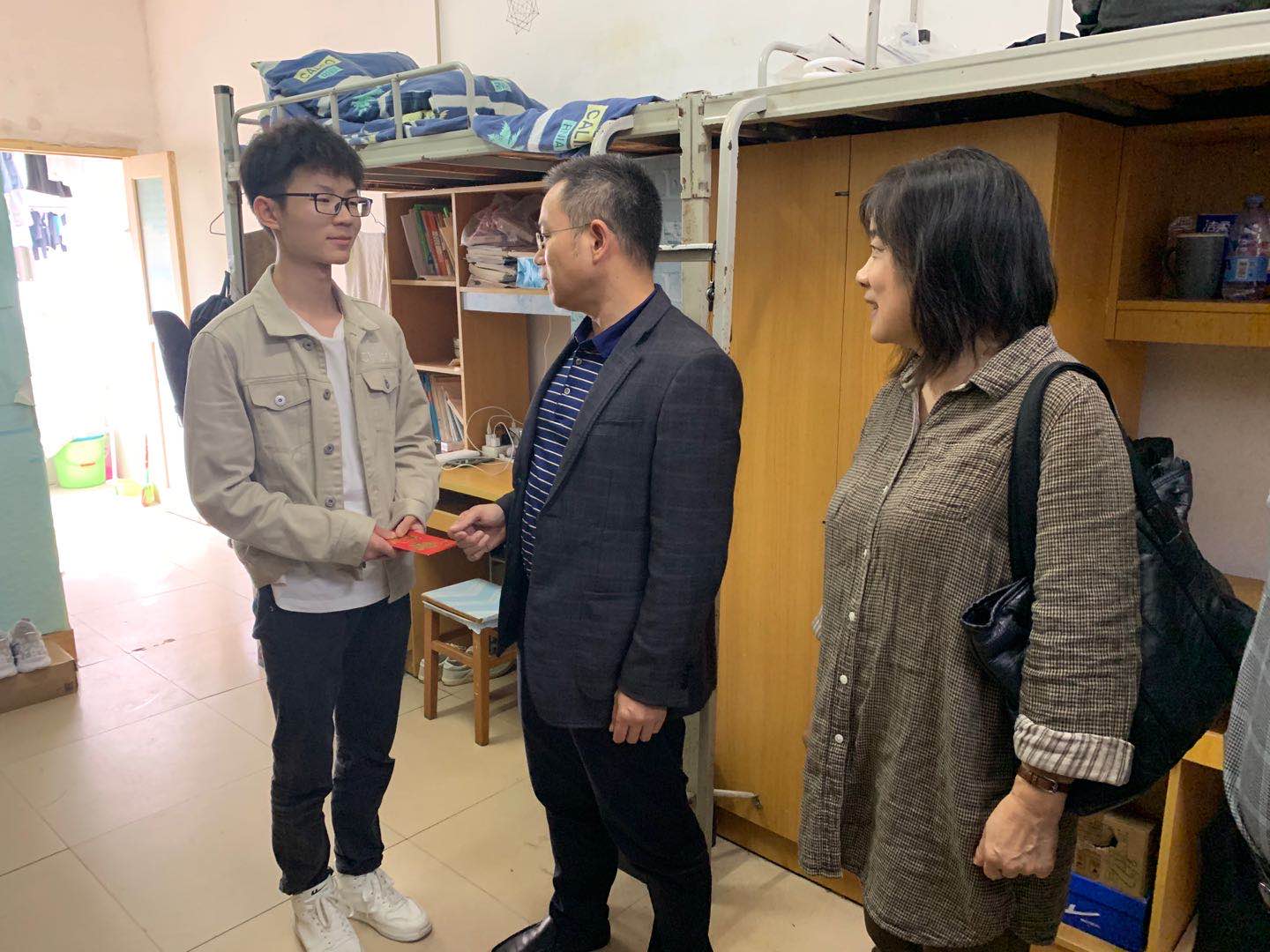 在男生宿舍,张校长送上了慰问金、米、油,并亲切的问候了来自万载的同学,询问了家庭、学习情况,鼓励其树立信心,将一时的困难和挫折当做磨砺,不断自我提升,在学业和未来的工作中获得更大的进步。面对学校领导和老师们的关心关怀,学生倍感亲切和温暖,表示会不忘初心,努力学习。