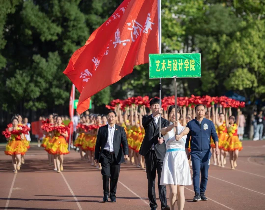 紧接着,各学院代表队用创意表演向大家展现了他们的专业特色:电商与旅游学院学生身着制服,表演职业礼仪;艺术与设计学院的同学们手持金花,舞姿婀娜;各个学院表演独具一格,响亮的口号中展示着他们必胜的决心。