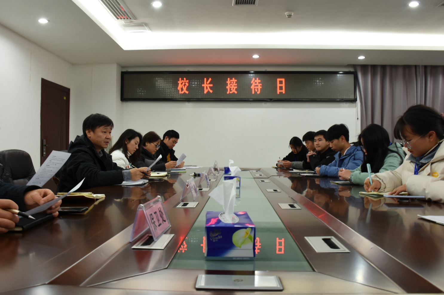 会议伊始,学生代表们踊跃发言,就网络安全、失物招领、教学设施、食堂饭菜价格等问题提出意见与建议。相关部门负责人认真倾听,及时记录,耐心地为同学们答疑解惑,提供解决思路和后续改进方案。