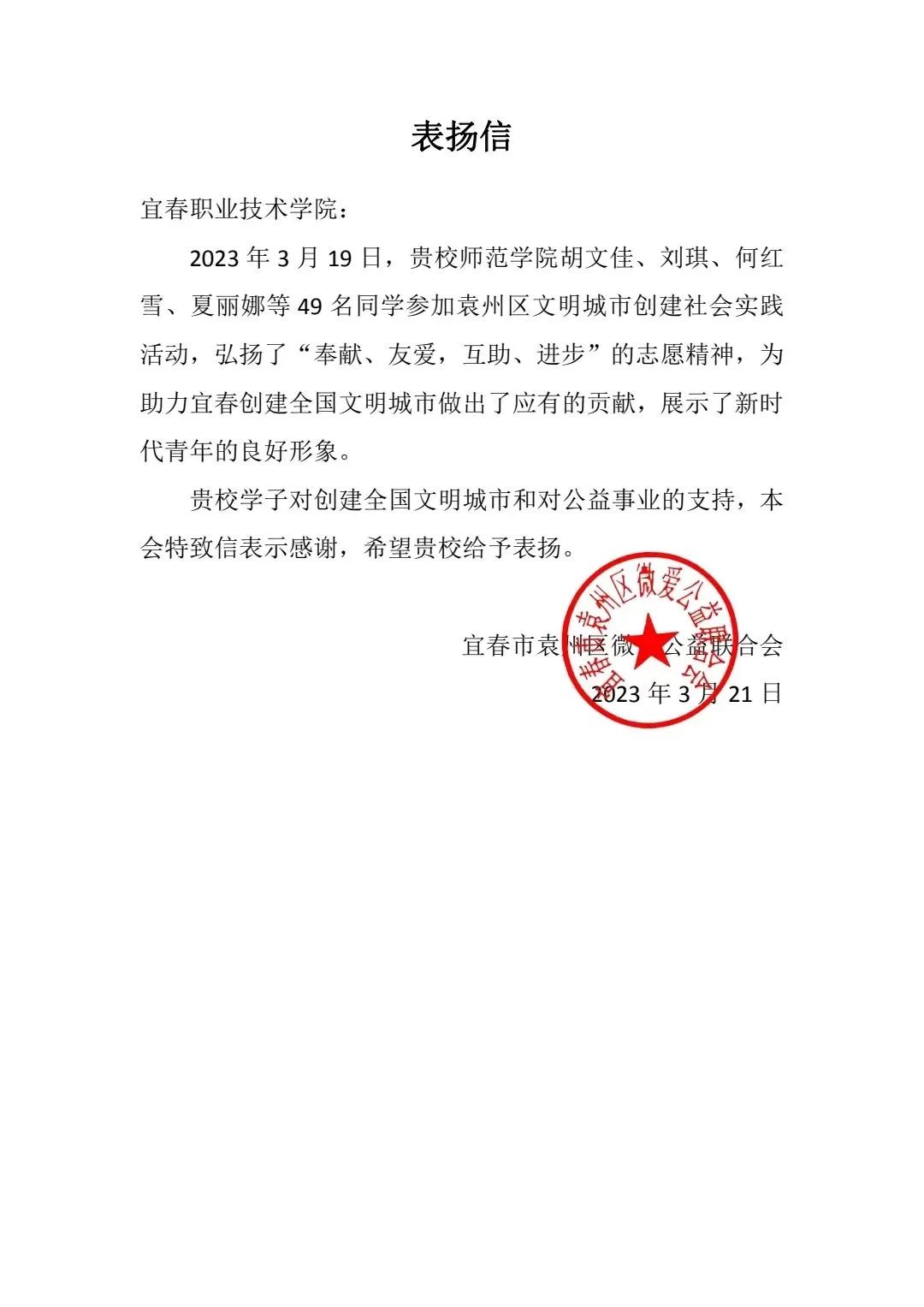 3月21日,开云官网收到一封来自宜春市袁州区微爱公益联合会发来的感谢信。信中对开云官网师范学院粉笔头志愿者服务队49名学子参与创建全国文明城市和对公益事业的支持表示感谢,高度赞扬了开云官网学子在此次袁州区文明城市创建社会实践活动中的表现。