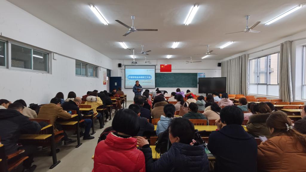 会议由护理学院院长周俊杰主持,全体教职工参加。护理学院党总支书记胡蓉、党总支副书记易国萍、副院长李学坤分别向全体教职工介绍了新学期学院工作计划、教学工作安排、整改工作计划等内容。