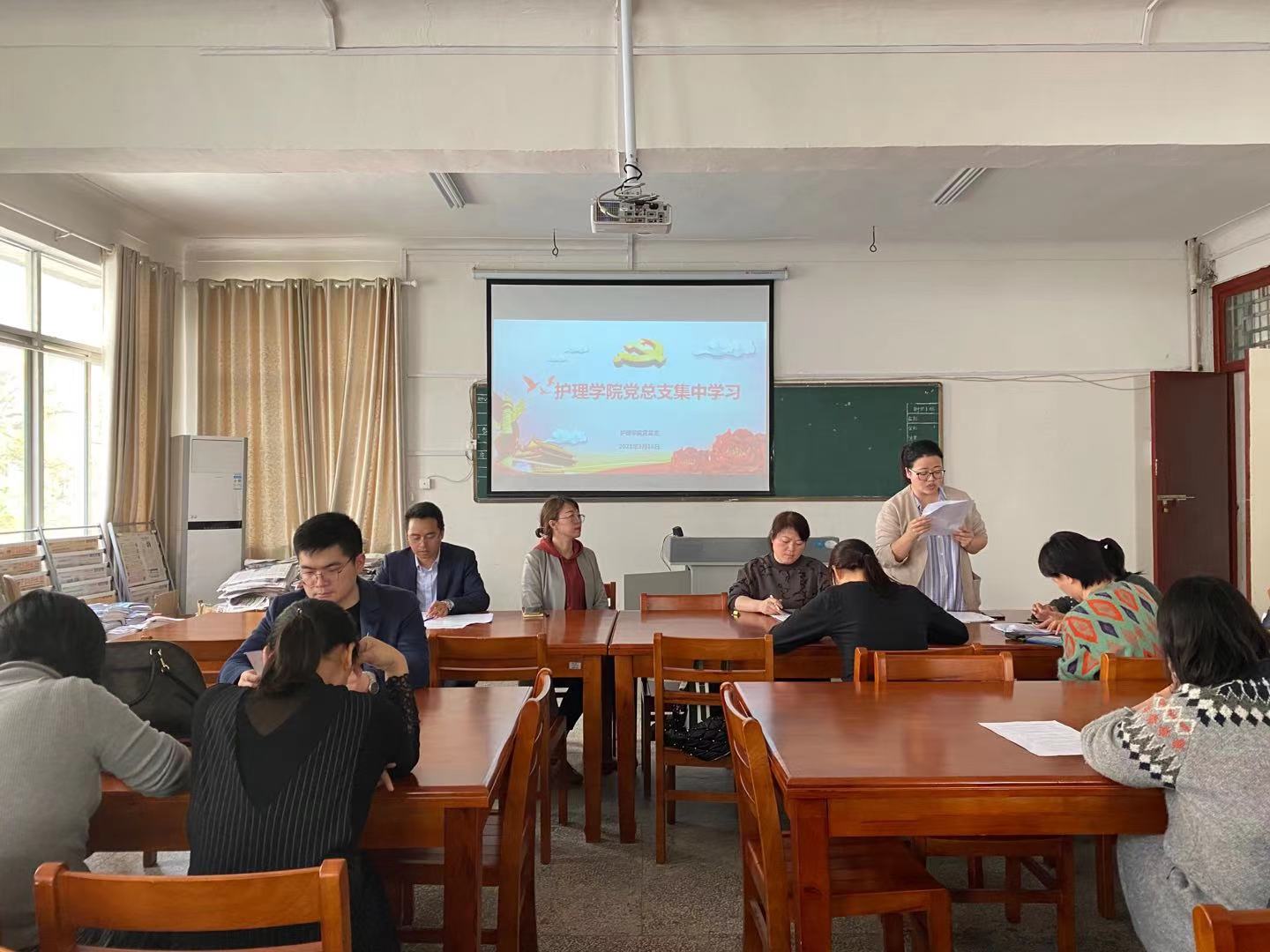 本站讯(护理学院 周玥)3月16日下午,护理学院党总支在南校区五教楼阅览室开展了2020年度组织生活会会前集中学习活动。活动由党总支书记胡蓉主持,全体党员参加。