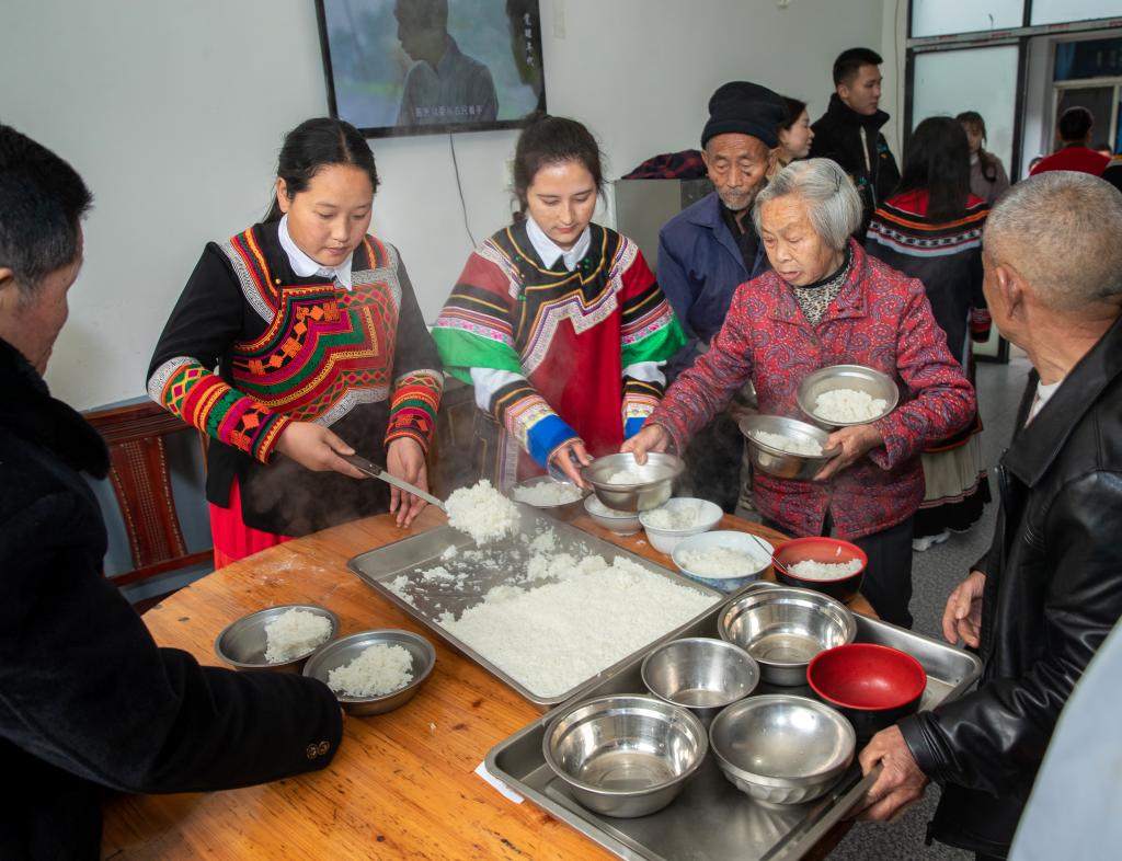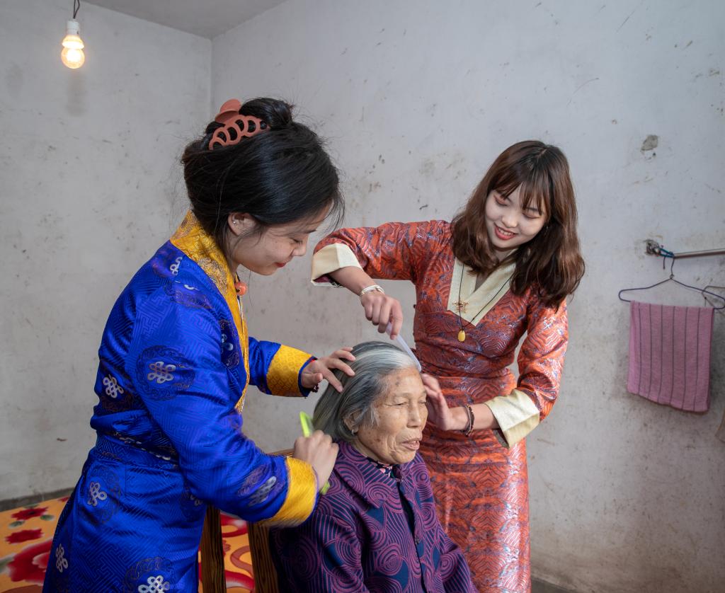 剪指甲、梳头发、话家常、清扫房间、晾晒被褥......同学们耐心细致地帮助老人们清洁清扫。“坨坨肉切小一点、炖烂一点!这样方便爷爷奶奶们入口食用”厨房里,彝族同学们正制作他们只有在节日才会做的坨坨肉,藏族的姑娘们则忙着擀面、揉面,熬制当地特色美食牛肉疙瘩汤。