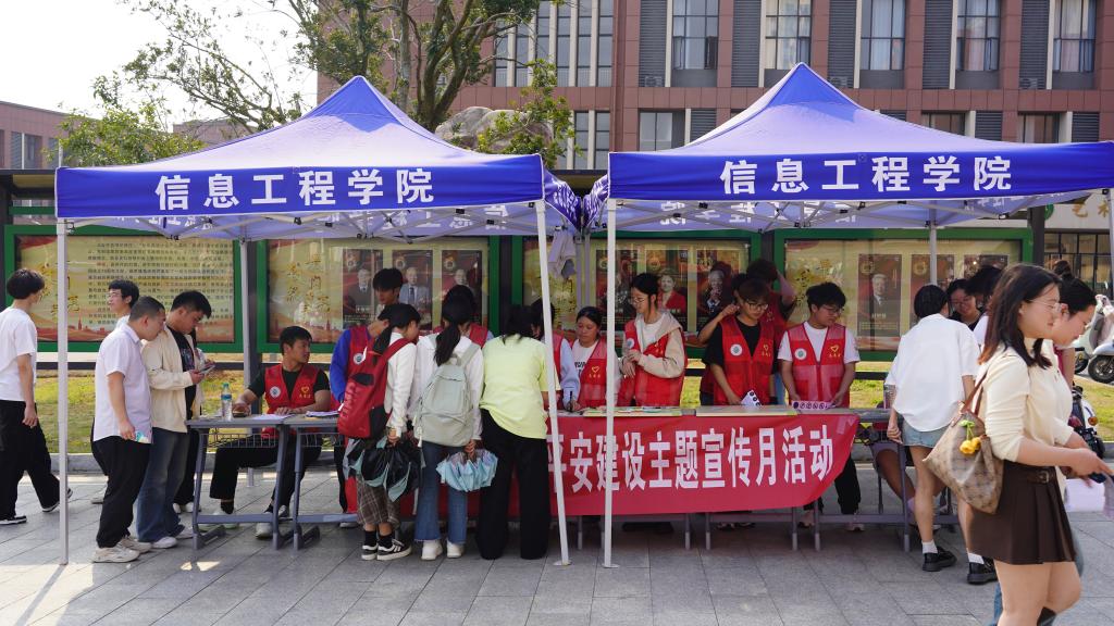 本站讯(信息工程学院 黄彪)为扎实推进平安校园建设,增强青年学生的安全观念与法治意识,提高自我保护能力,3月25日,信息工程学院学生志愿者在东区食堂广场开展平安建设主题宣传活动。