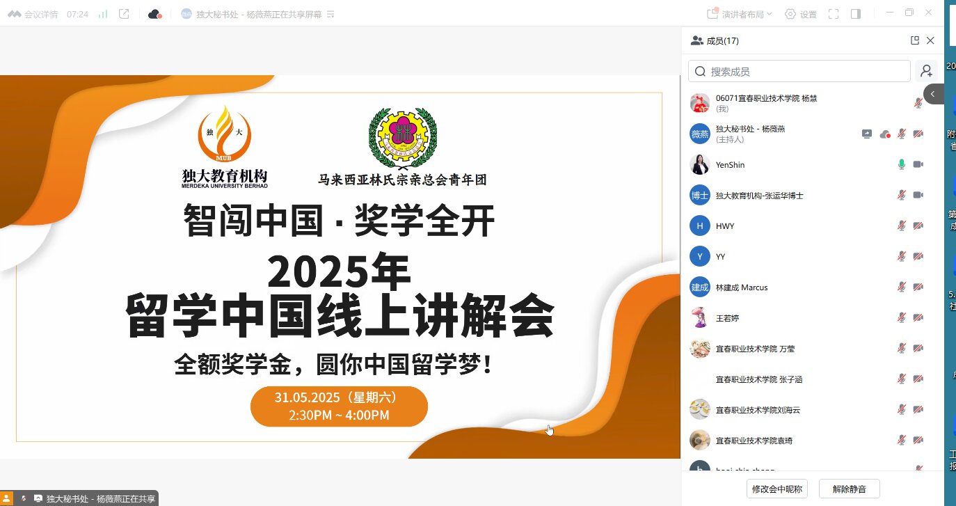 本站讯(国际合作与交流处 杨慧)5月31日下午,我校国际合作与交流处处长刘海云、副处长杨慧,部分二级学院专业教师应邀参加由马来西亚独大教育机构、马来西亚林氏宗亲总会青年团主办的2025年“智闯中国.奖学全开”留学中国线上讲解会。