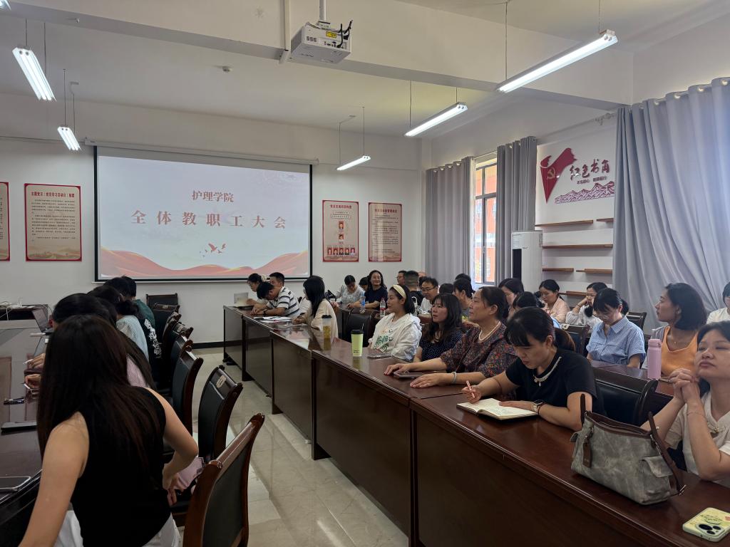 本站讯(护理学院陈丽红)以秋为序,扬帆起航。为总结过往,精准谋划新学期发展方向,进一步凝聚师资力量、提升办学效能,8月27日,护理学院在和济楼C218召开全体教职工大会。会议由党总支书记吴少林主持,全体教职员工参会。