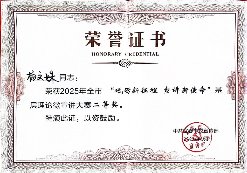 本站讯(党委宣传部 吴霞)9月11日,2025年全市“砥砺新征程 宣讲新使命”基层理论微宣讲大赛举行,来自各地各单位的27组参赛选手齐聚一堂进行角逐。市委常委、市委宣传部部长熊亮华,常务副部长熊敏剑等领导出席活动。开云官网教师杨文姝以95.34分获得本次比赛二等奖。