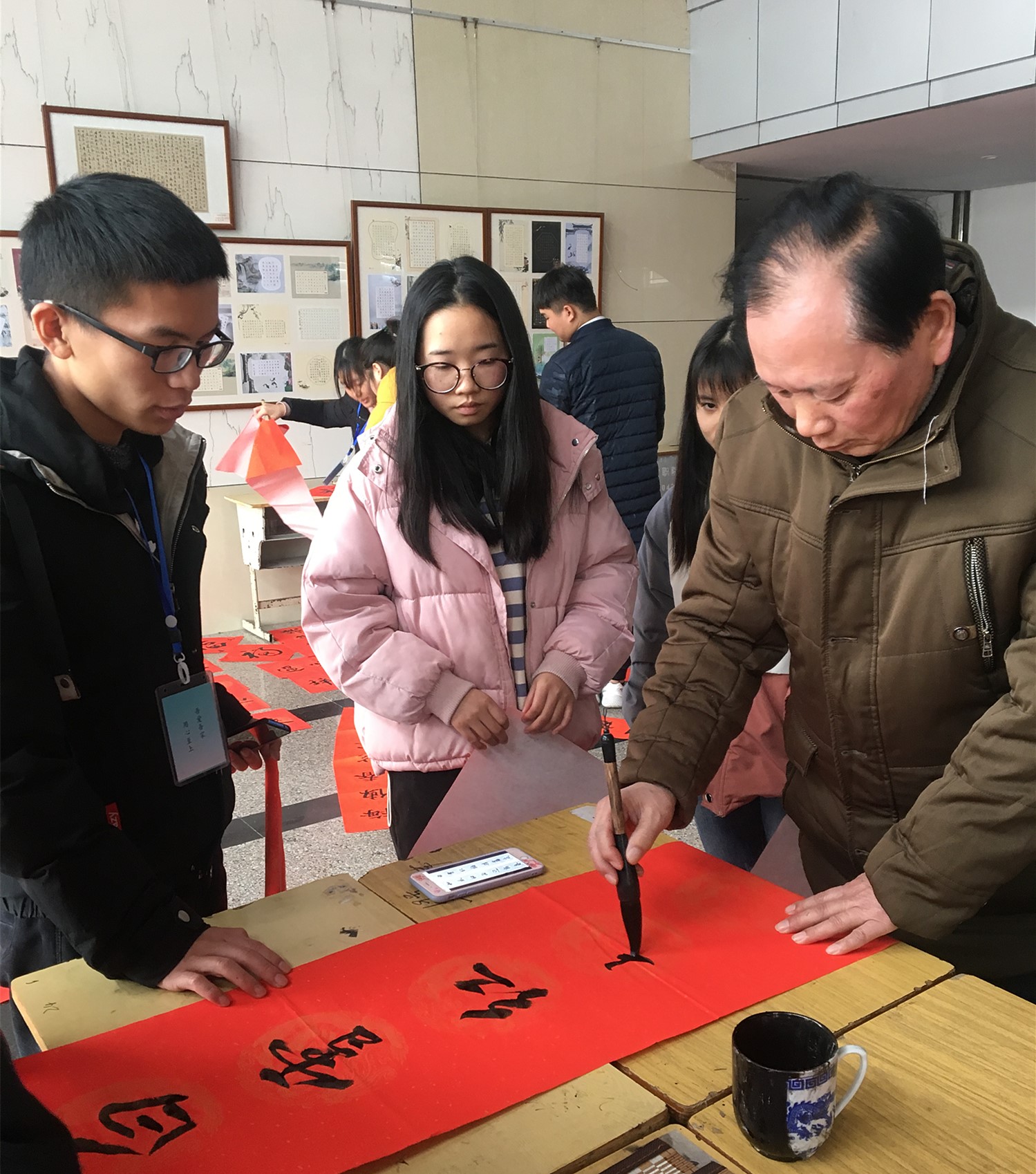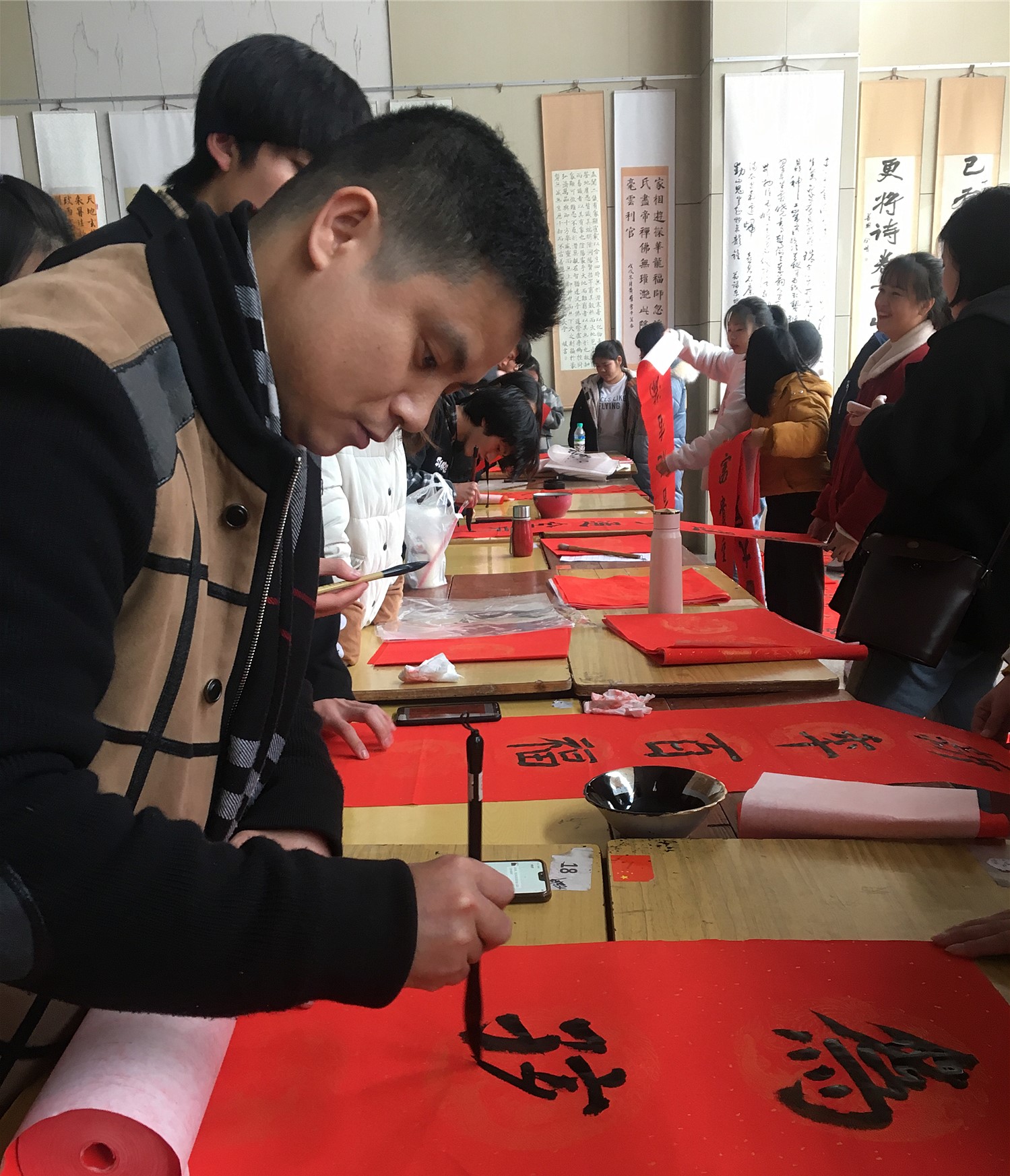 活动现场师生熙熙攘攘,笔墨飘香四溢。邓艺、杨平贵、钟友文、汪林根四位书法老师现场教学,精湛的书法技艺让师生们赞叹不已。参与的学生里也人才辈出,优秀的作品接连不断地从一支支游走的笔下诞生。春联作品为全校师生免费赠送,一度供不应求,活动举办地十分成功。