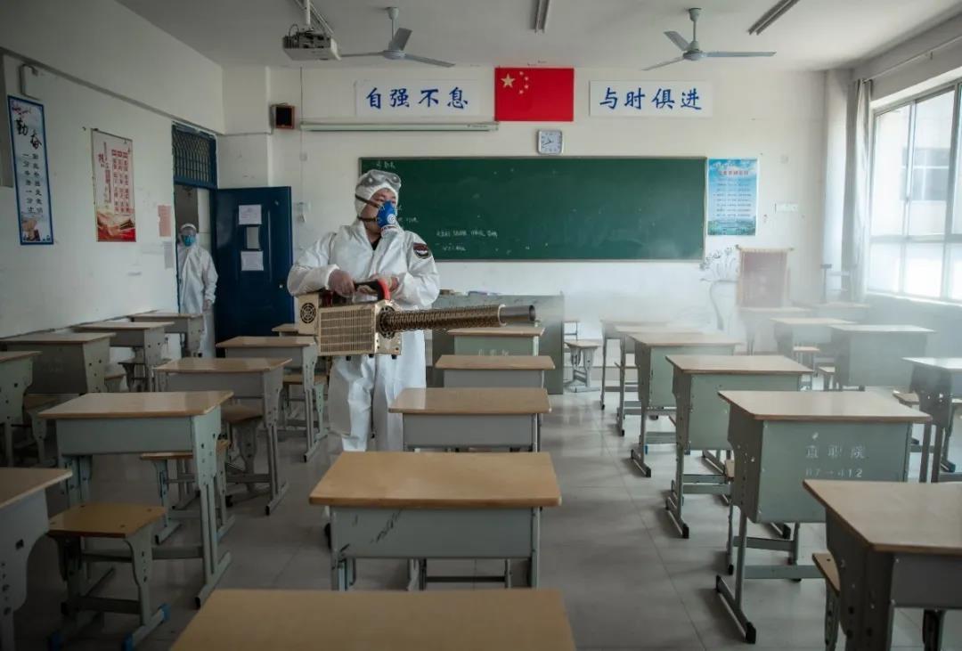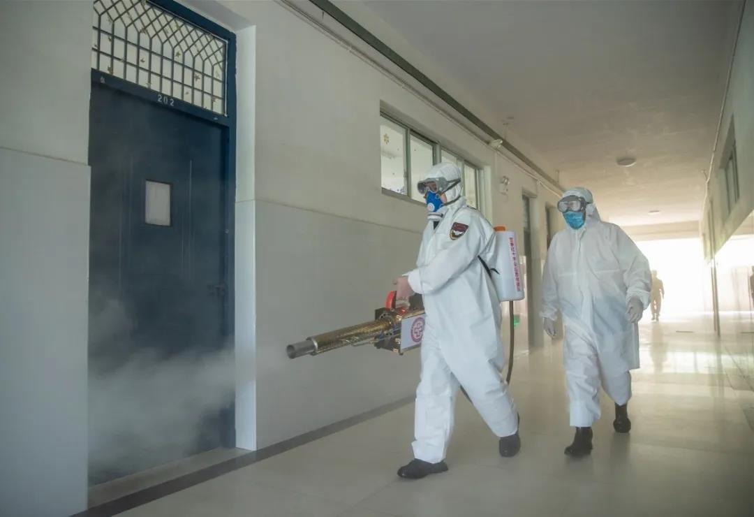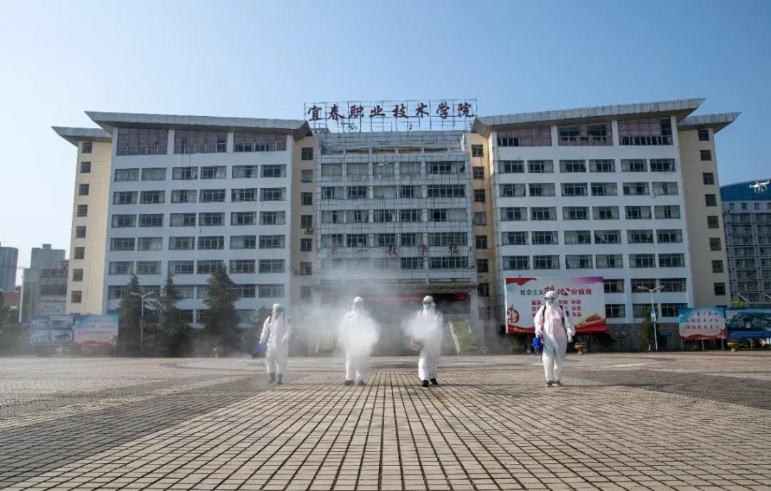学校请来了宜春市红十字会救援队的专业人员,在校内物业公司日常消毒的基础上对校园内第一批复学的区域进行了全面消毒。
